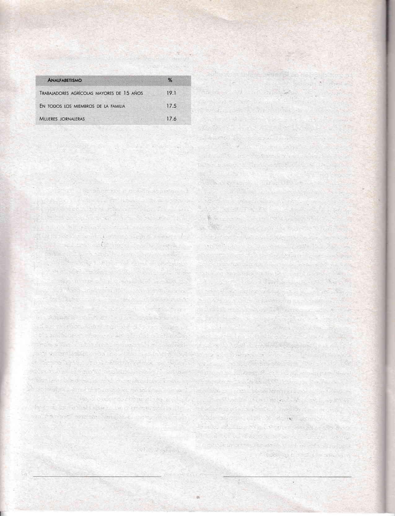En lo que respecto o lo educoción, existe 19.1Yo de onolfobetismo entre los troboiodores moyores de 15 oños; mientros que en todos los miembros de lo fomilio se regislro 17 .5%o. En porticulor en los muieres el onolfobetismo llego o 17 .60/o. Solomente 27o/o de los miembros de fomilios de iornoleros ogrícolos ho terminodo su inslrucción primorio. Si se comporo lo onterior con los dotos sobre onolfobetismo poro todo el estodo y el municipio de Mexicoli, que es 3.9 % poro el primero y 3.7 o/o poro el segundo, entonces se observo un morcodo problemo de onolfobetismo en esie sector de trobojodores.