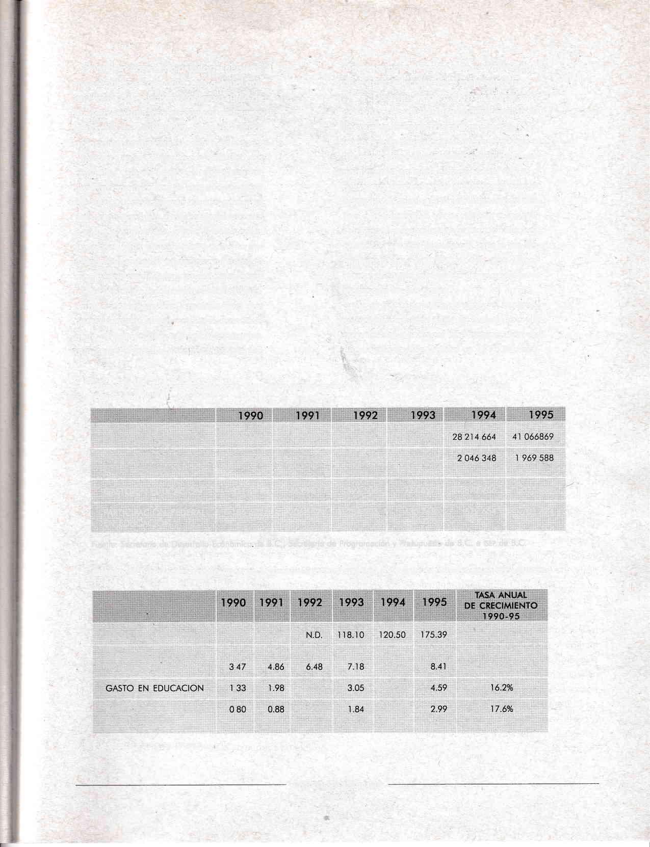 Costellonos Everordo, lo toso ero de 5.8%; y yo poro el sexenio de Roberto de lo Modrid Romondío (l 983-l 989) disminuyó o 3.2o/o; por si fuero poco, poro el periodo sexenol de Xicoténcotl Leyvo Mortero y Ór.or. Boilón Chocón (l 989- I 995), lotoso de coberturo del bochilleroto escolorizodo boio hosto 2.4 % onuol. Ello indicq lo poco que hon podido hocer Ios odministrociones estotoles por reve¡1ir esto tendencio. Bien cobe recordor que mienlros este comportomiento de lo coberturo del sistemo escolorizodo de bochilleroto, es descendente y oritmético, lo loso de crecimiento promedio onuol de lo pobloción totol del estodo, que es de 5.1%, es creciente y de orden geométrico duronte el periodo de I 990- l 995. Es decir, oun cuondo son diferentes ospectos, se puede observor uno reloción inverso entre estos dos indicodores, Io cuol podrío ser uno explicoción de lo disminución de lo copocidod de coberturo.