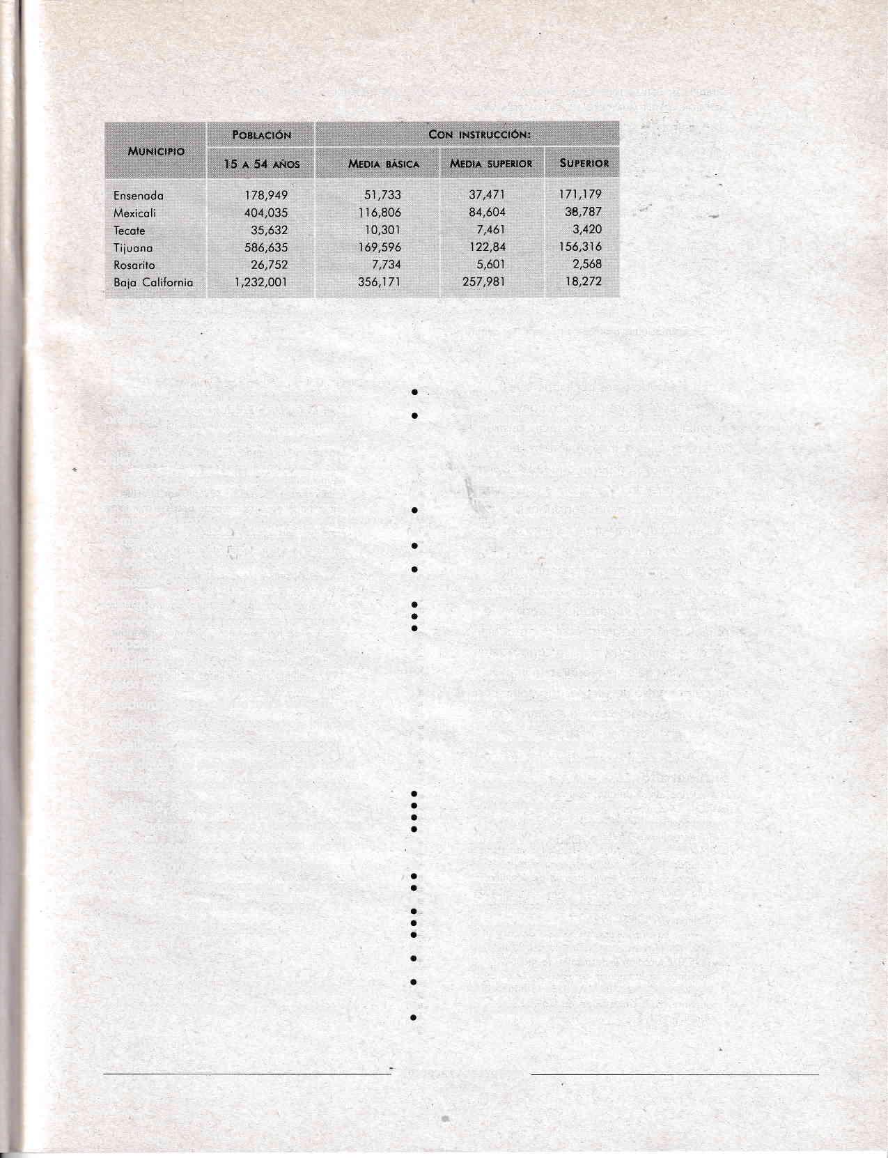 primer lugor, se tomoron los porcentoies que orroió el conteo de .l995, los cuoles revelon que 5.77o/o de lo pobloción de Boio Colifornio no iiene oprobodo ningún grodo escolor; los que tienen primorio incompleto (16.49%) y completo (17 .82%); con secundorio (28.91o/o); con bochilleroto (20.94oA); con educoción superior (9.60A); y 0.47% de dotos no especificodos. Con estos dotos se colculó el totol de lo pobloción de l5 oños y mós sin instrucción por municipio.
