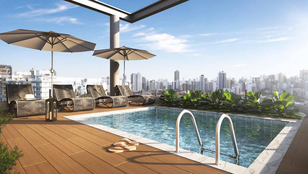 COWORKING EM BALANÇO COM GRAB & GO, PRAÇA DE BOAS-VINDAS E LEITURA, CO-LAUNDRY, PUB C/ TERRAÇO E GRAB & GO, FITNESS COM PÉ DIREITO DUPLO E PAREDE DE ESCALADA, PET PLACE, PISCINA E SOLÁRIO NO ROOFTOP.