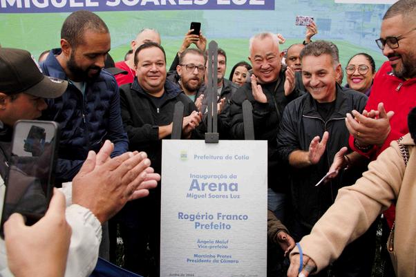 Diversos esportistas da cidade e líderes de bairro participaram da entrega da Arena Os vereadores Marcinho Prates (presidente da Câmara), Serginho, Sandrinho, Celso Itiki e Sérgio Folha também prestigiaram o evento “Quem é desta região passou pelos treinos do Miguelzinho Vimos muitos jogos aqui com muita rivalidade, este local tem história Agradecemos ao prefeito Rogério Franco por esta