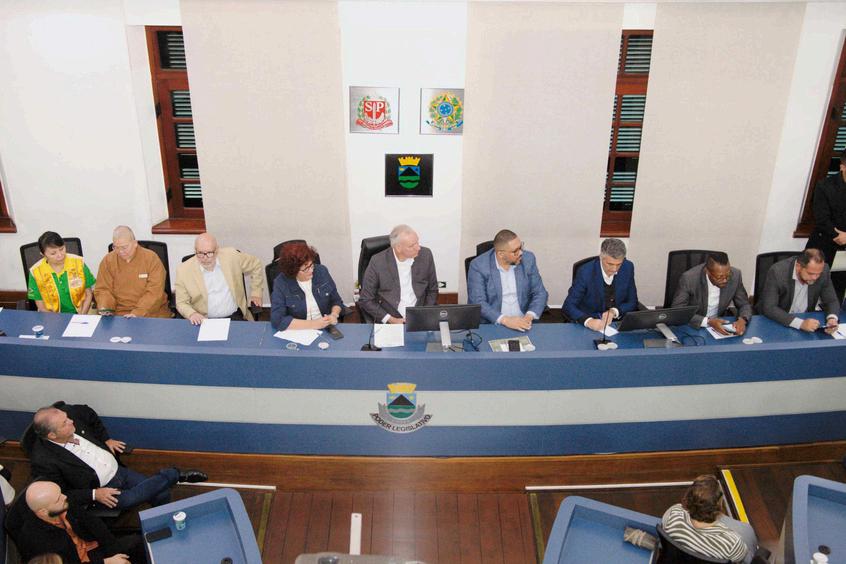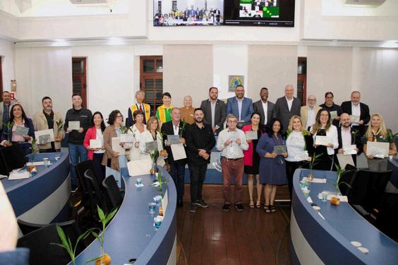 Entre os homenageados estavam representantes de veículos de comunicação, de cooperativa de reciclagem, de instituições de ensino, de agricultores, da indústria, de institutos, entre outros “Temos aqui, na Casa do Povo, representantes do Legislativo, Executivo, da indústria e da sociedade civil Isso mostra que estamos no caminho certo para fazermos o melhor possível Temos visto o que aconteceu no Rio Grande do Sul, e pode acontecer em qualquer parte do país Reunimos pessoas dedicadas com o meio ambiente e precisamos mapear e agir para mitigarmos danos em casos de risco”, enfatizou Mauro Daffre, presidente em exercício do Conselho Municipal do Meio Ambiente e Agropecuária (CMAA)