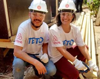 Leandro Almeida e Ana Constantino participaram do mutirão do projeto TETO em parceria com o Airbnb, ajudando a construir casas para famílias em situação de vulnerabilidade.