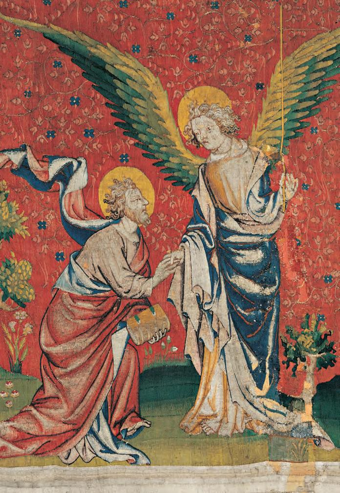 It is no accident that the famous Tapestry of theApocalypse is now kept in the Château of Angers, former residence of the Dukes of Anjou. For it was to one of them, Louis I, that, between 1373 and 1380, the King of France, Charles V, lent an illuminated manuscript of scenes from The Book of Revelation (L’Apocalypse in French), to make “his beautiful hanging”. The work was certainly commissioned by Louis I of Anjou between 1373 and 1377, because from that year the prince’s accounts note payments for the manufacture of the tapestry which must have been finished around 1382. They record that the King’s painter, Jean, known as Hennequin de Bruges, worked on the tapestry because he was paid for “pourtraitures et patrons” (designs and patterns), that is, the designs and perhaps some of the illustrations. Associated with the manufacture of the tapestry were the names of Nicolas Bataille and Robert Poirnçon: the latter’s workshops may have been sub-contracted for part of the work.