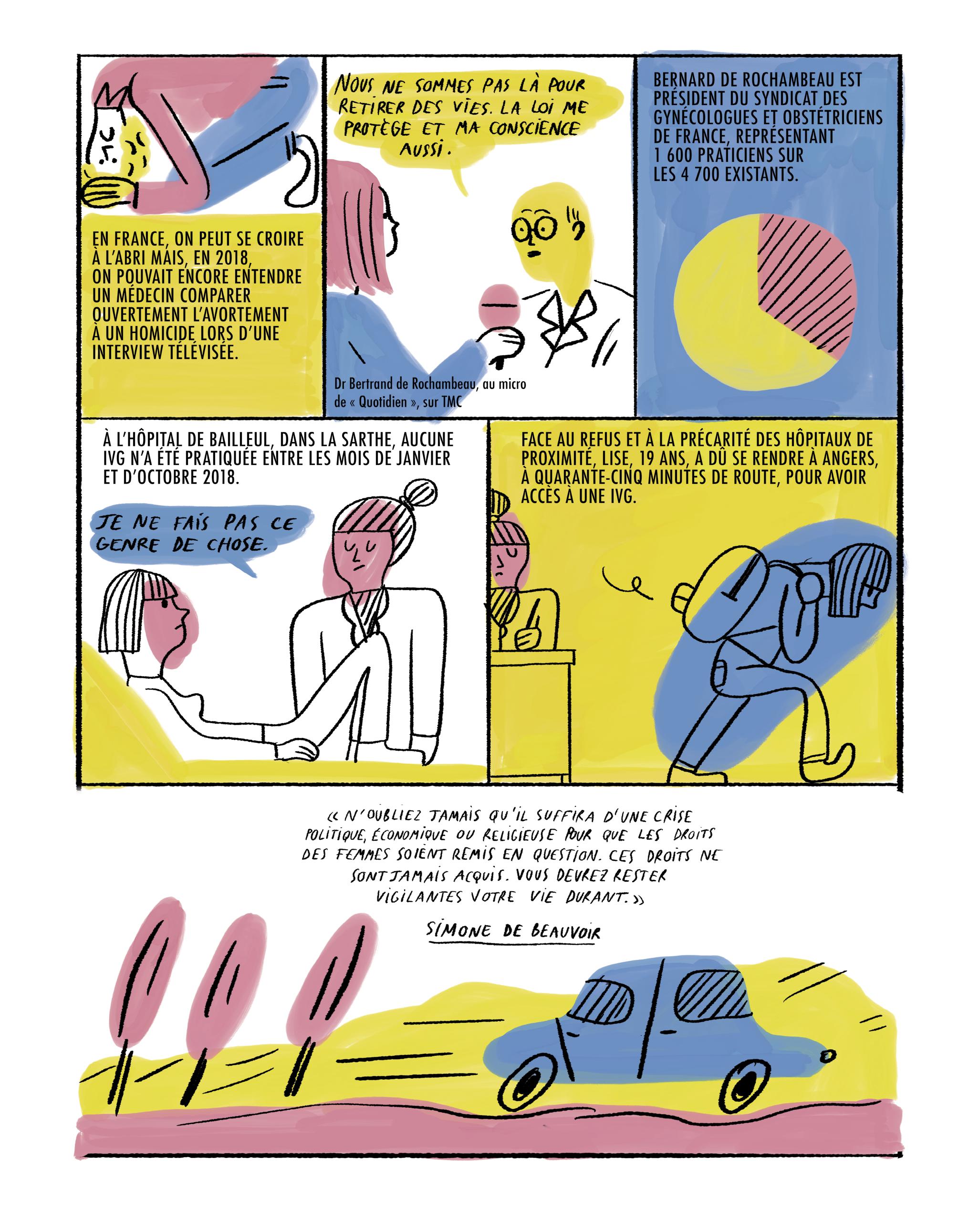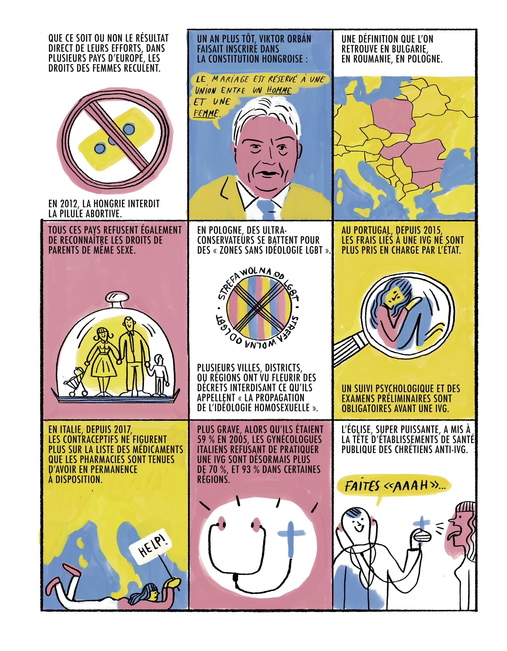 En réalité, le ressac a déjà commencé. En 2011, la Hongrie de Viktor Orbán a fait inscrire dans la Constitution que « la vie humaine est protégée depuis la conception ». Au Portugal, en 2015, l’avortement jusque-là gratuit et libre est devenu payant et soumis à un examen psychologique. En Pologne, les avortements en cas de malformation grave du fœtus, un petit millier chaque année, sont interdits depuis janvier 2021. En Italie, les interruptions volontaires de grossesses en théorie garanties par la loi deviennent impossibles dans les faits avec plus de la moitié des gynécologues du pays — et jusqu’à 95 % dans certaines régions — brandissant leur clause de conscience. Si bien qu’au tournant des années 2020, dans certaines régions d’Europe, les « faiseuses d’anges » sont de retour tandis que celles qui le peuvent parcourent des centaines de kilomètres pour aller avorter à l’étranger. Sou rance physique, détresse psychologique, risque d’être condamnée par la justice ou d’y laisser la vie… Leur sort n’est pas plus enviable que celui des Françaises des années 1960.
