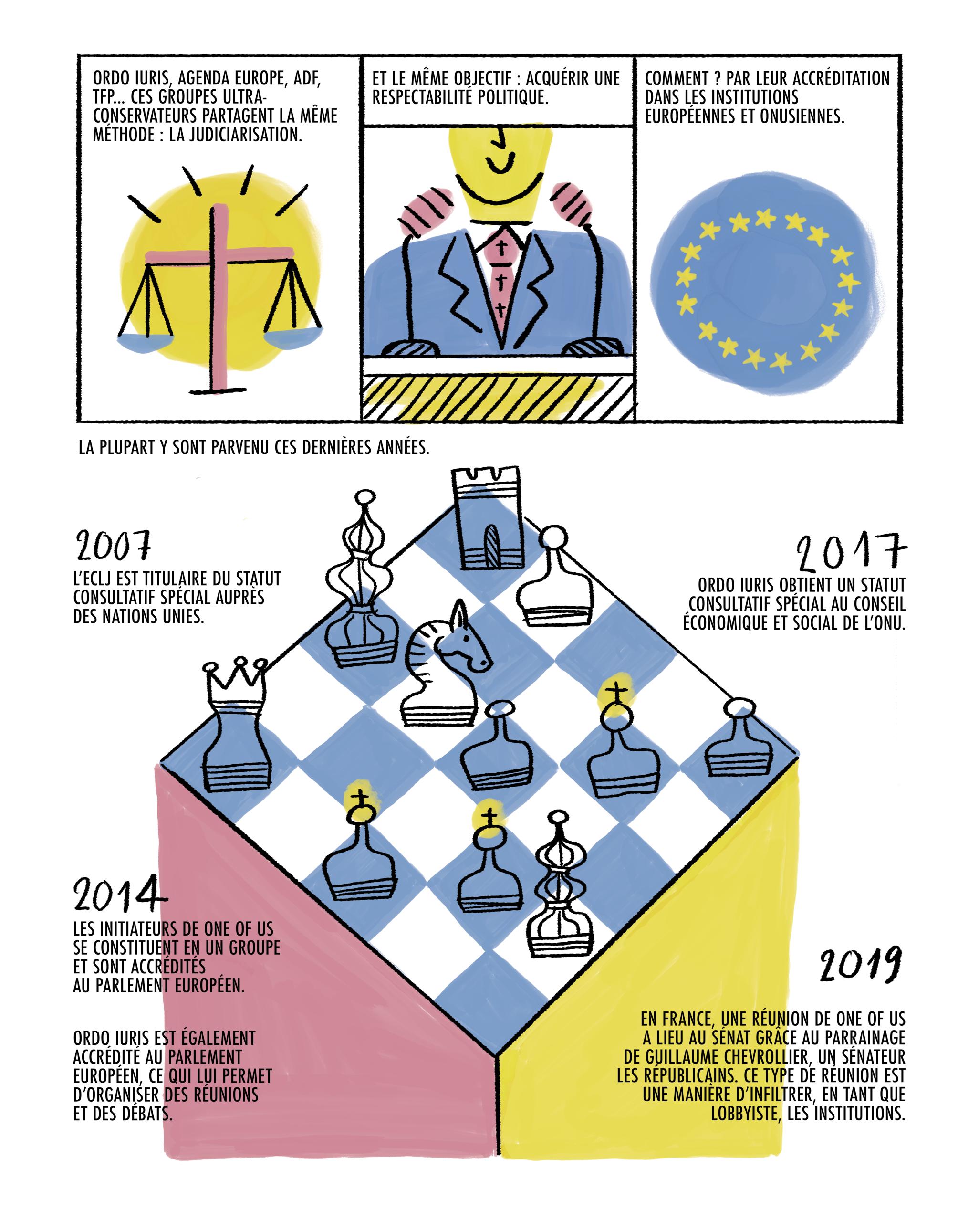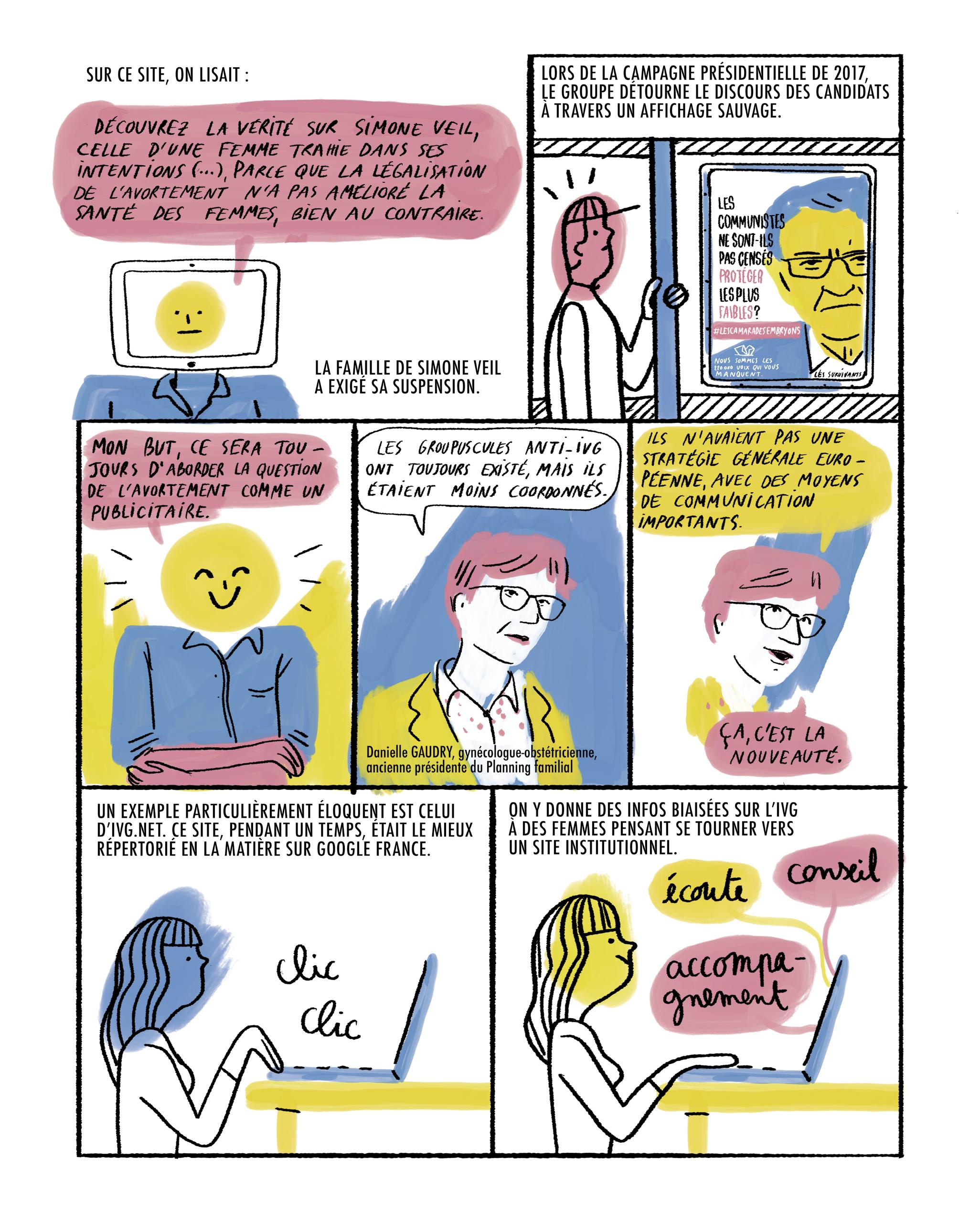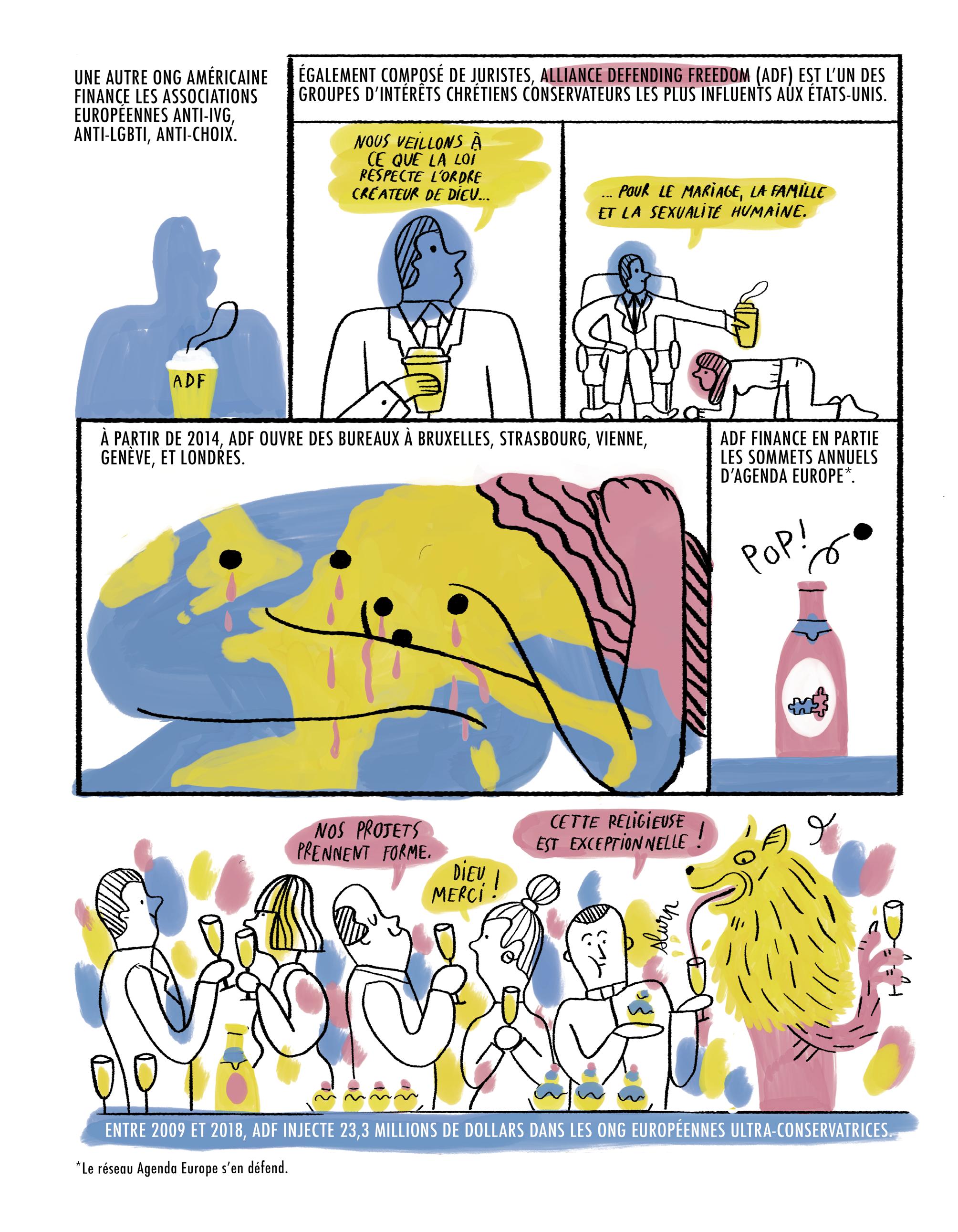 déploient tout un arsenal de techniques de lobbying, du recours juridique à l’activisme en ligne, pour faire reculer les législations. La France n’est pas épargnée par l’influence de ces groupes de pression. En juin 2021, Emmanuel Macron déclarait dans le magazine Elle n’être « pas favorable » à la proposition de loi autorisant un allongement de douze à quatorze semaines au motif qu’un avortement dans ces délais serait un « traumatisme » pour les femmes. Un discours typique de la rhétorique anti-IVG. « La liberté de décider, on s’est battus pour la gagner, on se battra pour la garder ! » scandaient les féministes le 28 septembre 2021 à l’occasion de la Journée mondiale du droit à l’IVG. Dans le camp opposé, une internationale ultra-conservatrice fourbit ses armes pour faire du corps des femmes son champ de bataille.