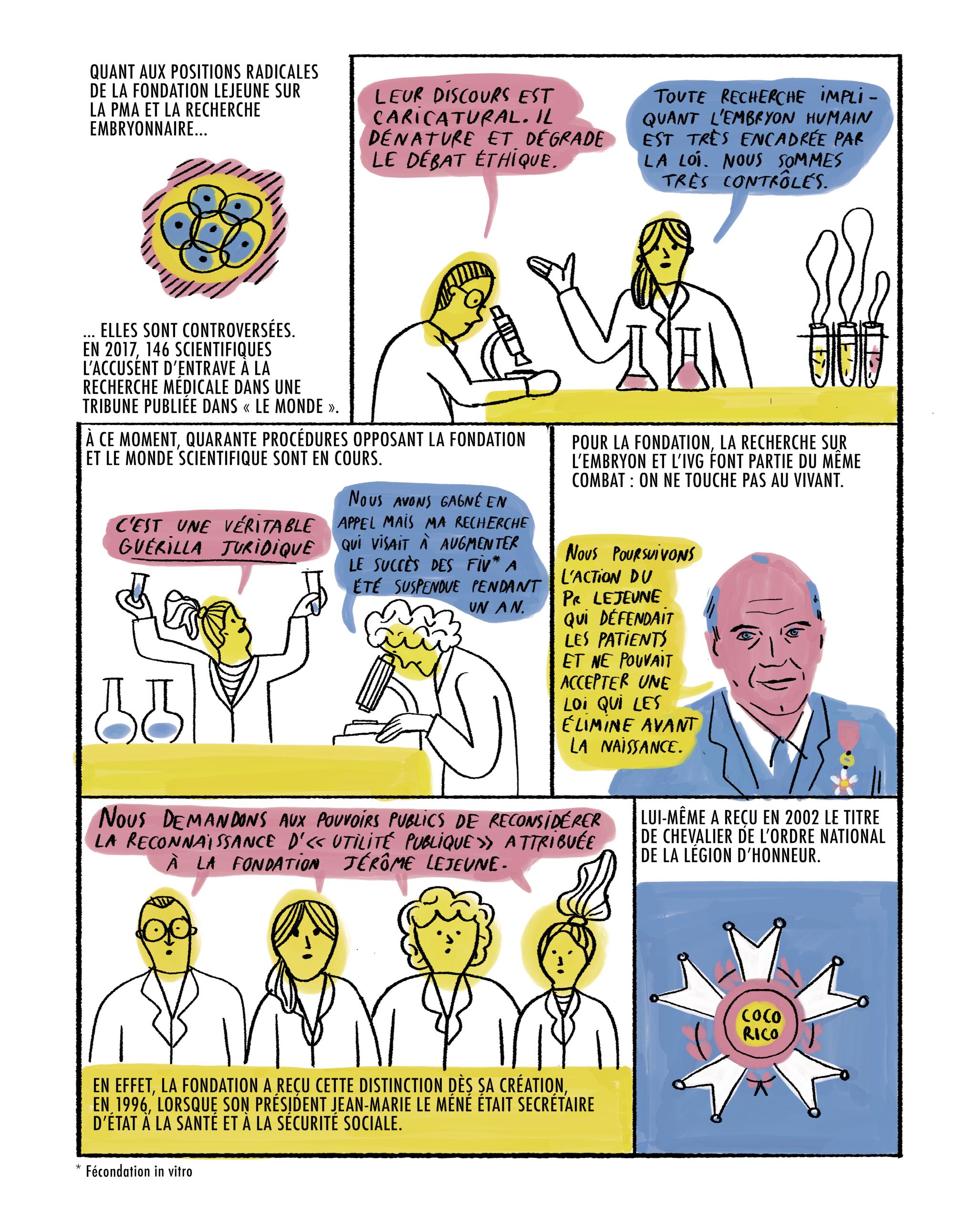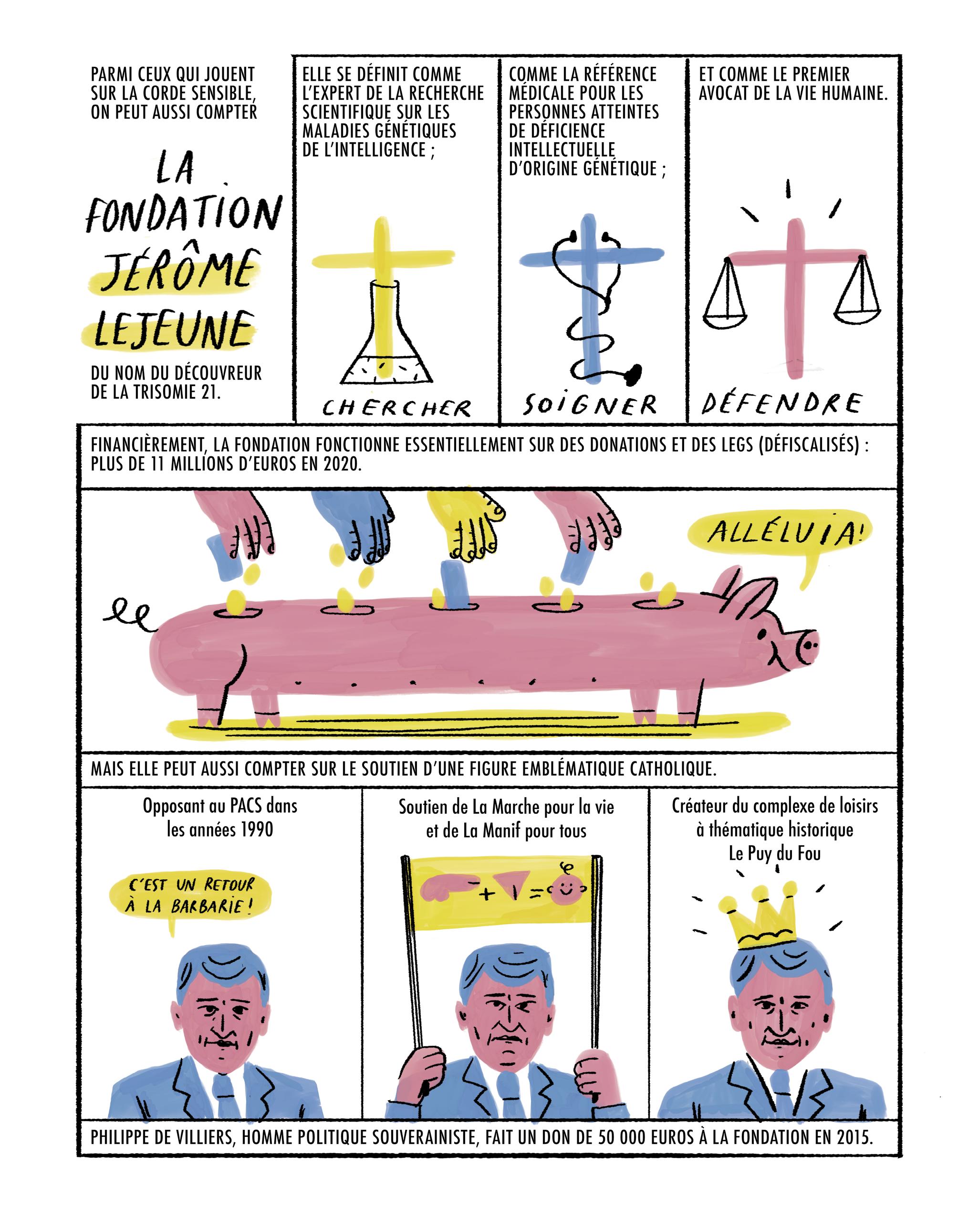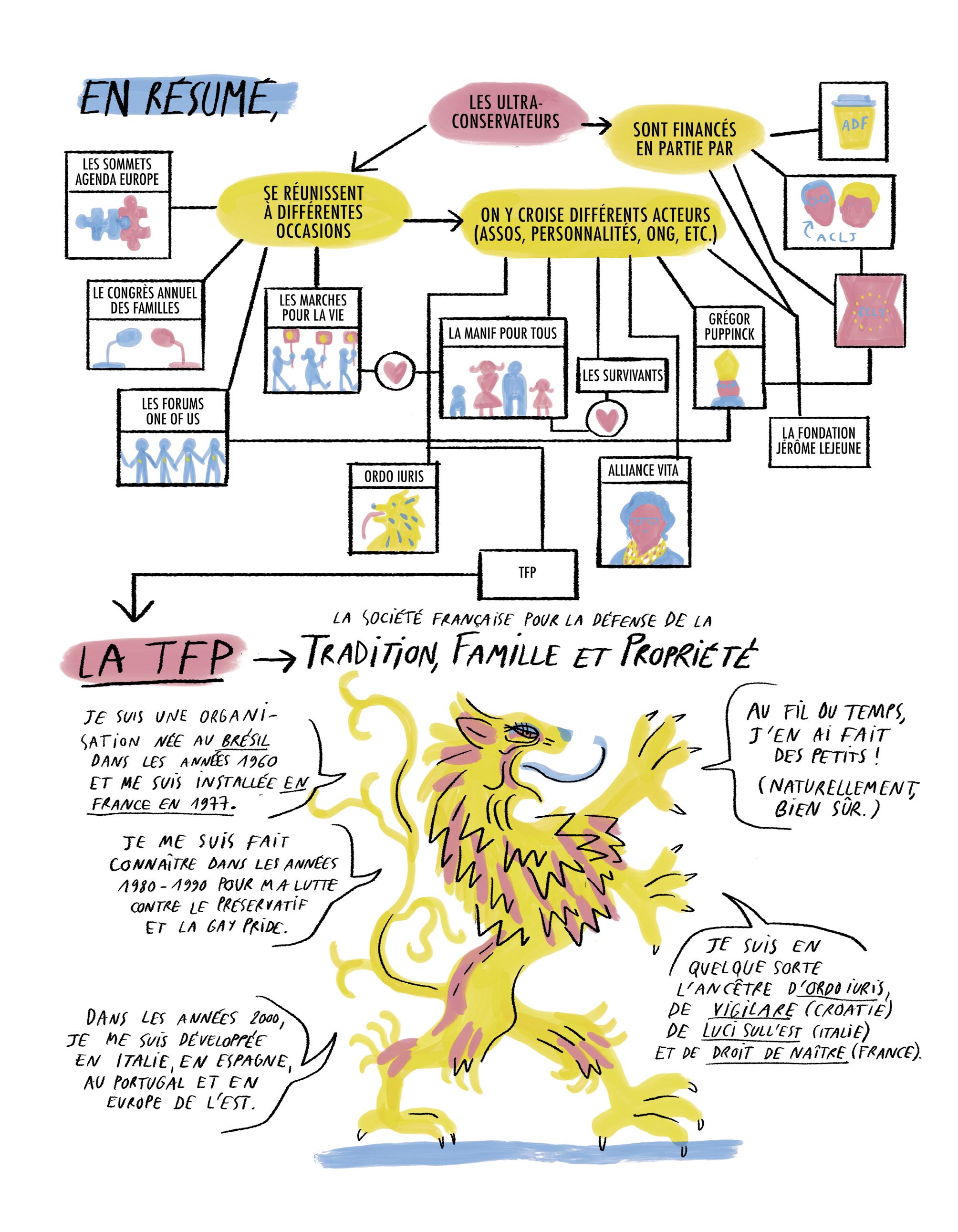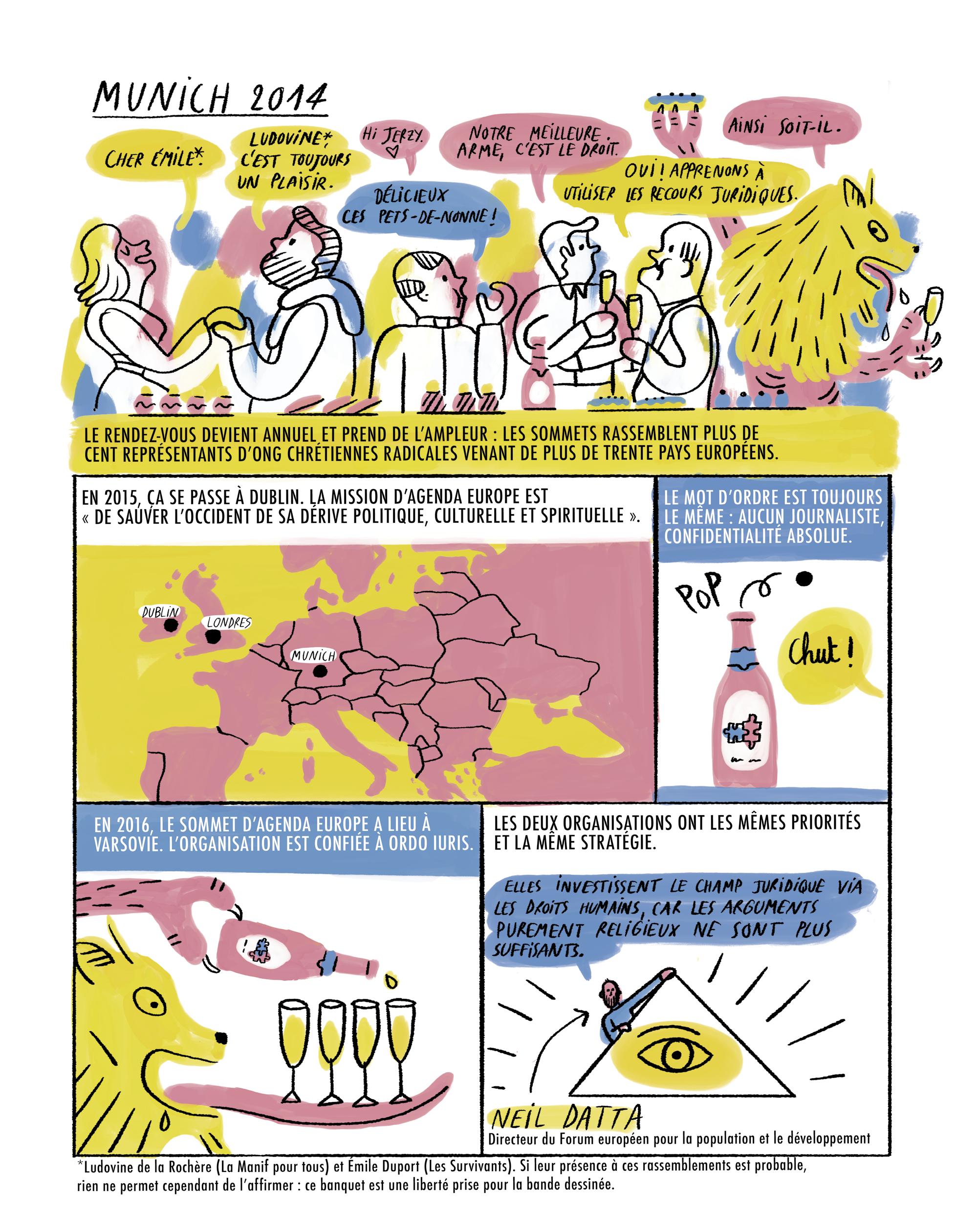 « Pour obtenir certaines informations de cette enquête, il m’a fallu avancer masquée… Je me suis fait passer pour une future mariée en quête d’un lieu de noces pour entrer dans le château du Jaglu, domaine appartenant à TraditionFamille-Propriété, où vivent ses dirigeants à une heure de Paris. Tous ont des liens avec Agenda Europe et la même cible dans leur viseur : les femmes. Au sein de cette luxueuse demeure, je n’en ai croisé qu’une seule… en cuisine, au sous-sol. » Audrey Lebel