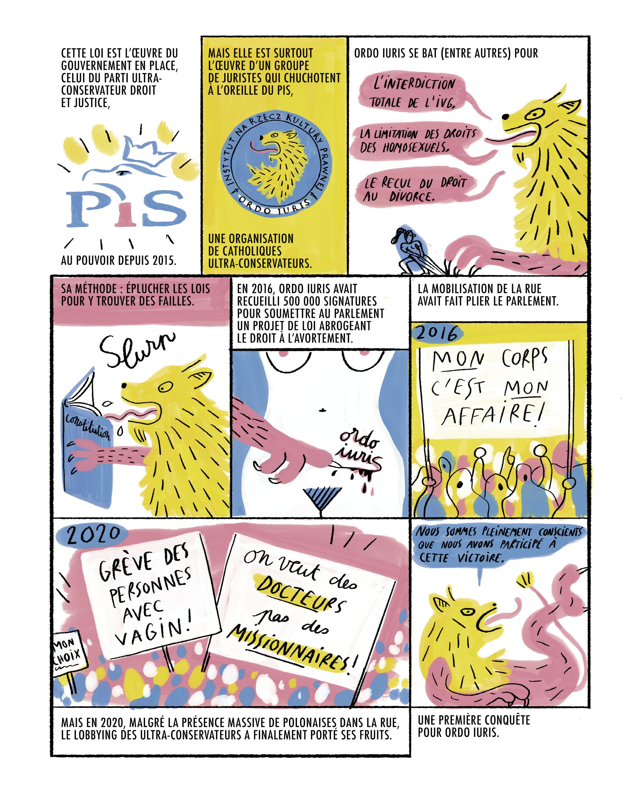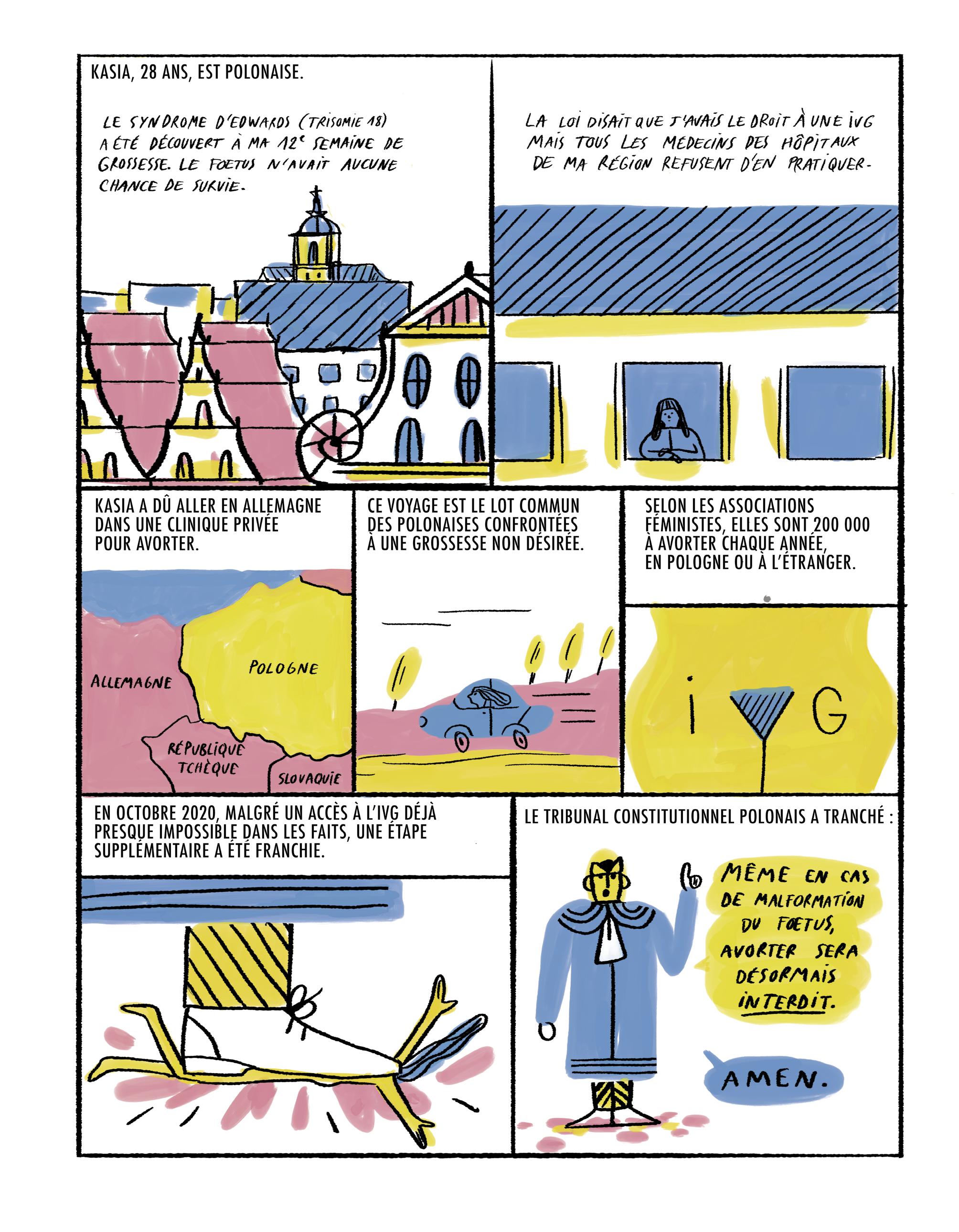 loi prévoit une récompense d’au moins 10 000 dollars pour toute personne engageant des poursuites à son encontre. Cette vague n’a rien d’un mouvement naturel. Elle est le fruit d’une contre-o ensive réactionnaire. Au cœur de la rhétorique des anti-IVG, le fantasme d’un « déclin moral de toute la société ». Sous les auspices du Vatican, d’églises orthodoxes ou évangélistes, ceux-ci aiment à se croire « du côté de la vie ». Dans le détail, les arguments sont plus variés : d’un soi-disant « droit du père » à la peur d’une « baisse de la natalité ». Ces discours, inaudibles il y a encore dix ans, portent leurs fruits. En 2020, 32 pays dont la Pologne ou la Biélorussie ont signé une « déclaration pour la santé de la femme et le renforcement de la famille » qui s’attaque sans détour au droit à l’IVG. Galvanisées par leurs succès, les forces conservatrices