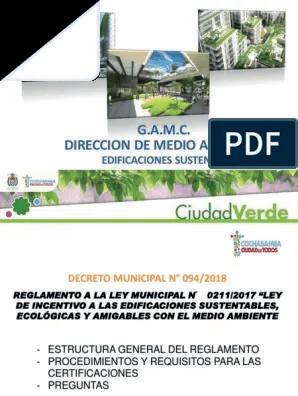 En este caso hacemos referencia a que un reglamento o normativa vigente en el lugar de intervención solicita incorporar al diseño siertas caractiristicas y/o cualidades que apoyen tanto al medio ambiente, al urbanismo, desde una forma de diseño hasta implentación de tecnologias, recibiendo asi mismo reconociminetos y beneficios por parte del mismo municipio, traducidos generalmente en reducción de impuestos o exepciones en los limites de contrucción. como es elñ caso de la D.M. 094/18 en la ciudad de cochabamaba