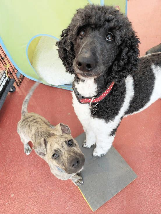 Photo: Skipper and Denali, a puppy who attended Puppy Power Hour, practicing duo perch with attention. Perch is a GREAT strategy to use when