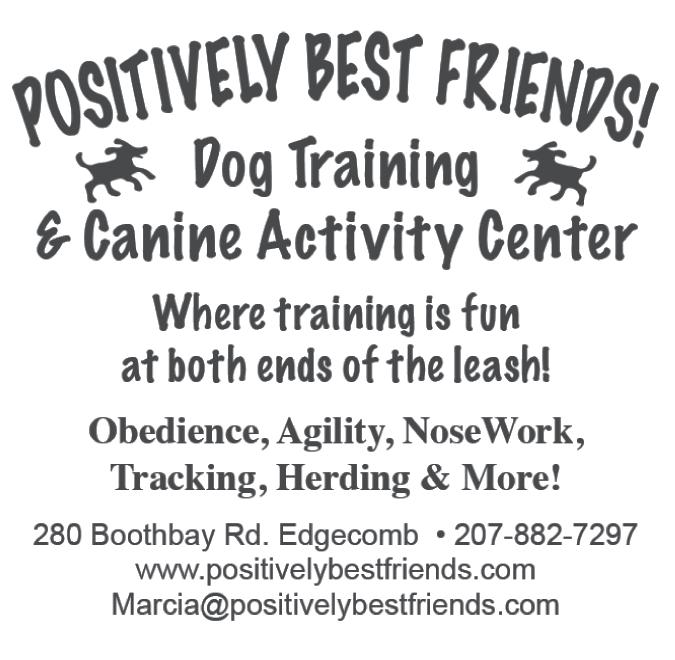 US OUT! www.loyalbiscuit.com BATH 180 Front Street BELFAST 1 Belmont Avenue BREWER 421 Wilson Street CAMDEN-ROCKPORT 56 Commercial Street ROCKLAND 408 Main Street WATERVILLE 109 Main Street Obedience Classes Activity Classes Free Puppy Preschool 270 State Rd. West Bath 04530 207.798.1232 www.mrdogtraining.com info@mrdogtraining.com Mr. Dog Training Check us out on Obedience Classes Activity Classes Free Puppy Preschool Training Videos • Positive reinforcement, relationship building classes for pups to seniors • Fun & Games Activities Classes • Training Videos • Online Classes & Clubs 85 Baribeau Drive Brunswick, ME 04011 207.798.1232 www.mrdogtraining.com info@mrdogtraining.com Check us out on Obedience Classes Activity Classes Free Puppy Preschool VOTED BEST TRAINER 2015! 270 State Rd. West Bath 04530 207.798.1232 www.mrdogtraining.com info@mrdogtraining.com Mr. Dog Training Check us out on Voted Best Trainer 2015-2019 Obedience Classes Activity Classes Free Puppy Preschool Training Videos Erin Bessey - CPDT-KA • Clicker Training • Basic Obedience • Private Lessons and more... Training that is fun for the whole family 72 S. Hunts Meadow Rd White eld, ME 04353 www.besseyspositivepaws.com Find us on Facebook