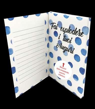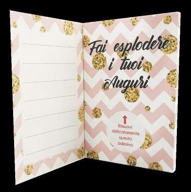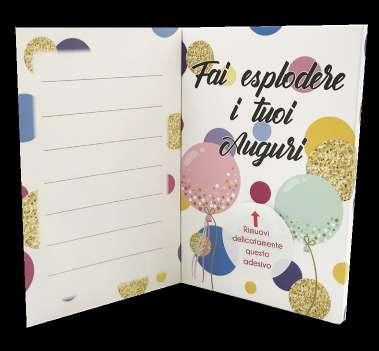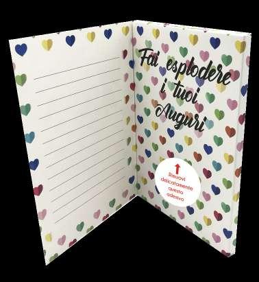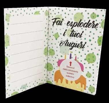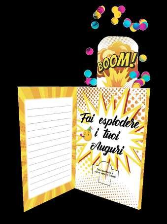 La Linea di biglietti Auguri Esplosivi fa partire la festa! Capovolgendo la linguetta all’interno del biglietto farai esplodere i coriandoli colorati al suo interno!