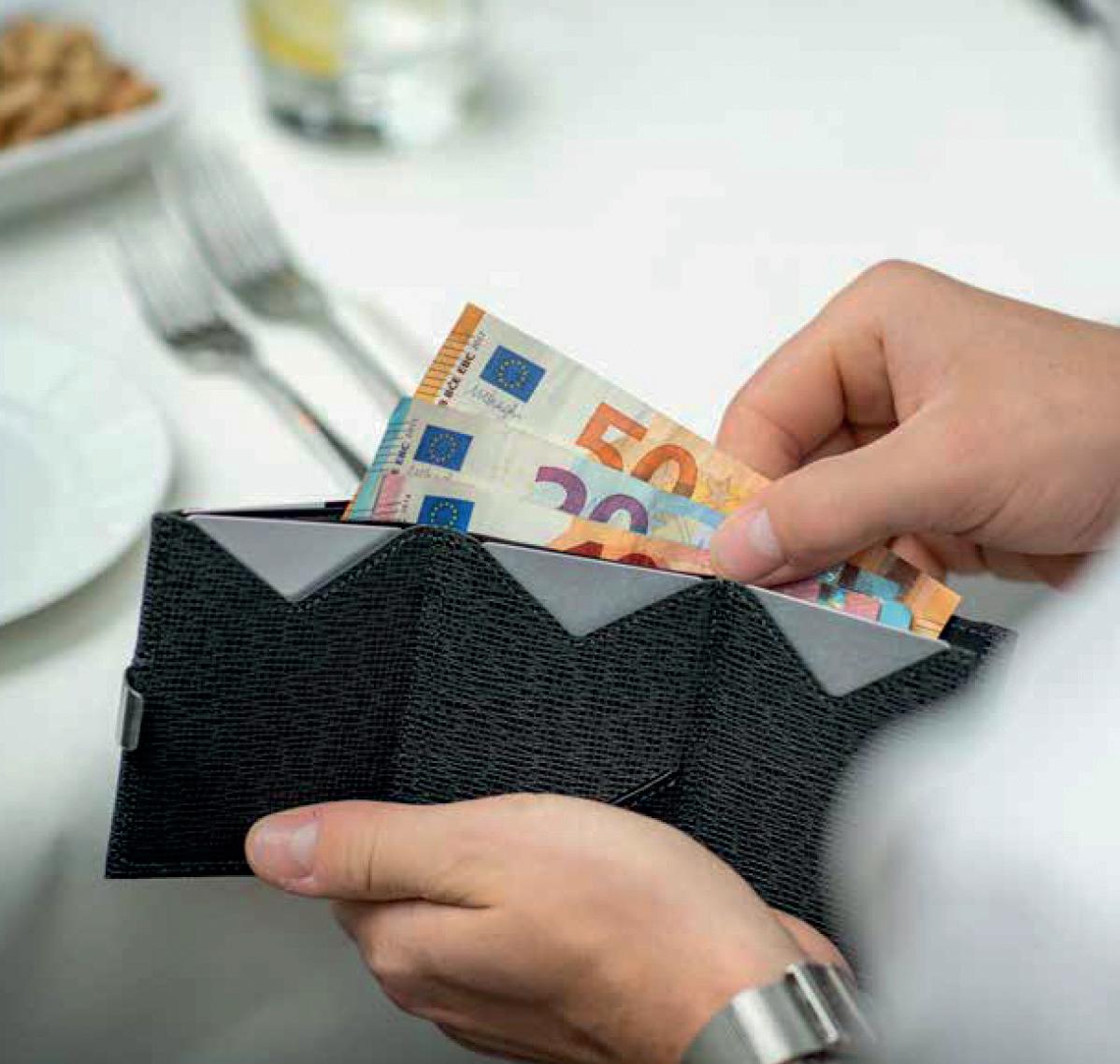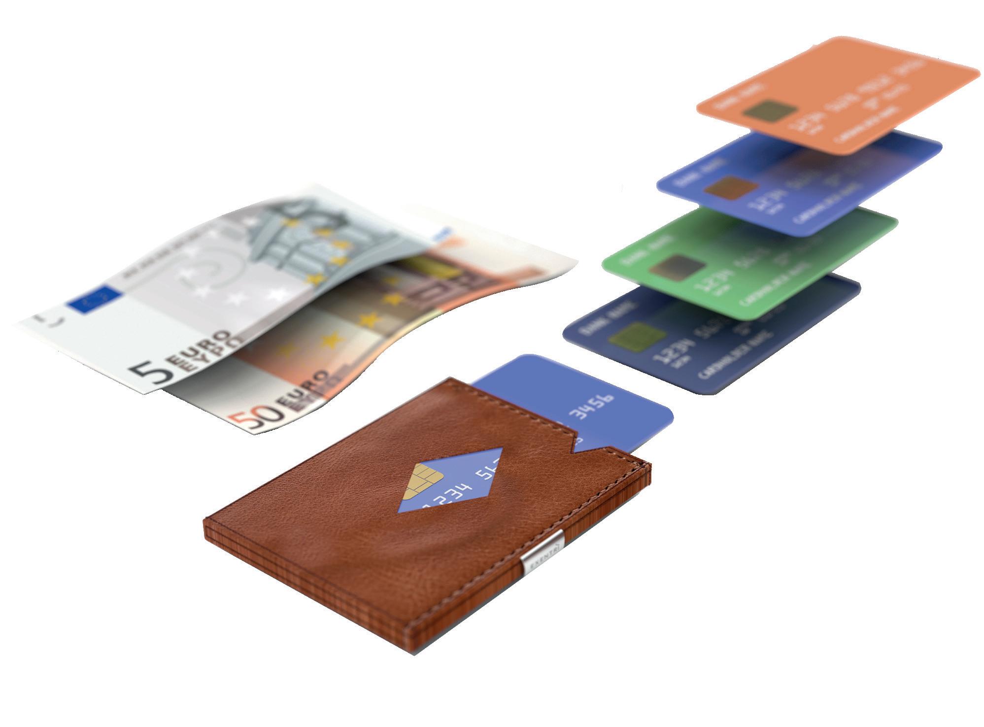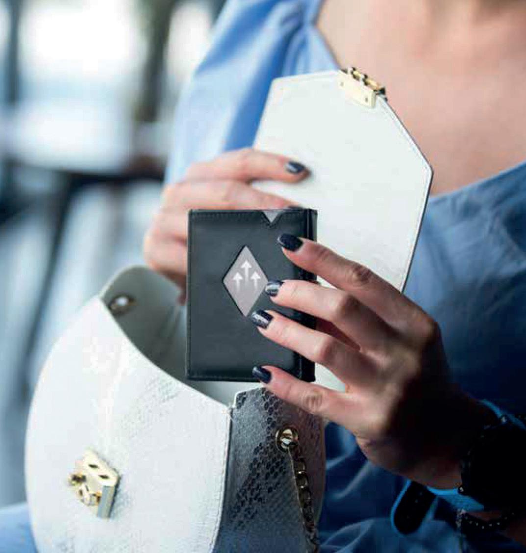 Tecnologia con blocco RFID integrato, invisibilmente crea uno scudo protettivo contro la lettura non autorizzata delle carte e dei documenti elettronici. Protezione costante senza attivazione o manutenzione contro il furto dei dati digitali. Implementata senza aggiungere spessore o peso, mantenendo un profilo sottile e una eleganza caratteristica.