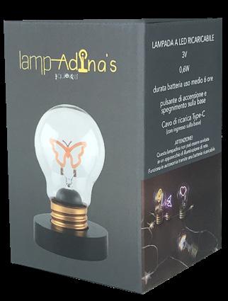 LampAdina’s è la decorazione creativa e colorata che arreda la tua casa, originale e ben stabile grazie alla sua base in legno che la rende l’unica lampadina LED ricaricabile autoportante sul mercato. Ha una batteria ricaricabile a lunga durata e la luce LED colorata è a basso consumo energetico. Il LED forma disegni e scritte colorate per adattarsi ad ogni ambiente e ad ogni personalità.