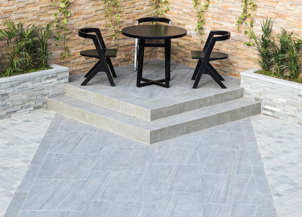 Experience the timeless elegance of our Station range, crafted to have the sophisticated appearance of slate. Available in four colours – black, iron, pearl, white – and three sizes, these premium quality tiles have a very lightly riven surface. Enhance your patio design with the perfect finishing touches, such as the step/coping downstand, bull-nosed edging, and porcelain setts.