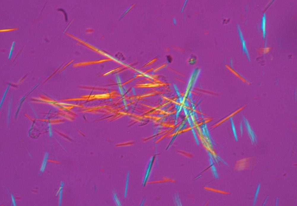 Les cristaux d’acide urique en forme d’aiguilles dans le liquide synovial, typiques de la goutte, observés au microscope à lumière polarisée.