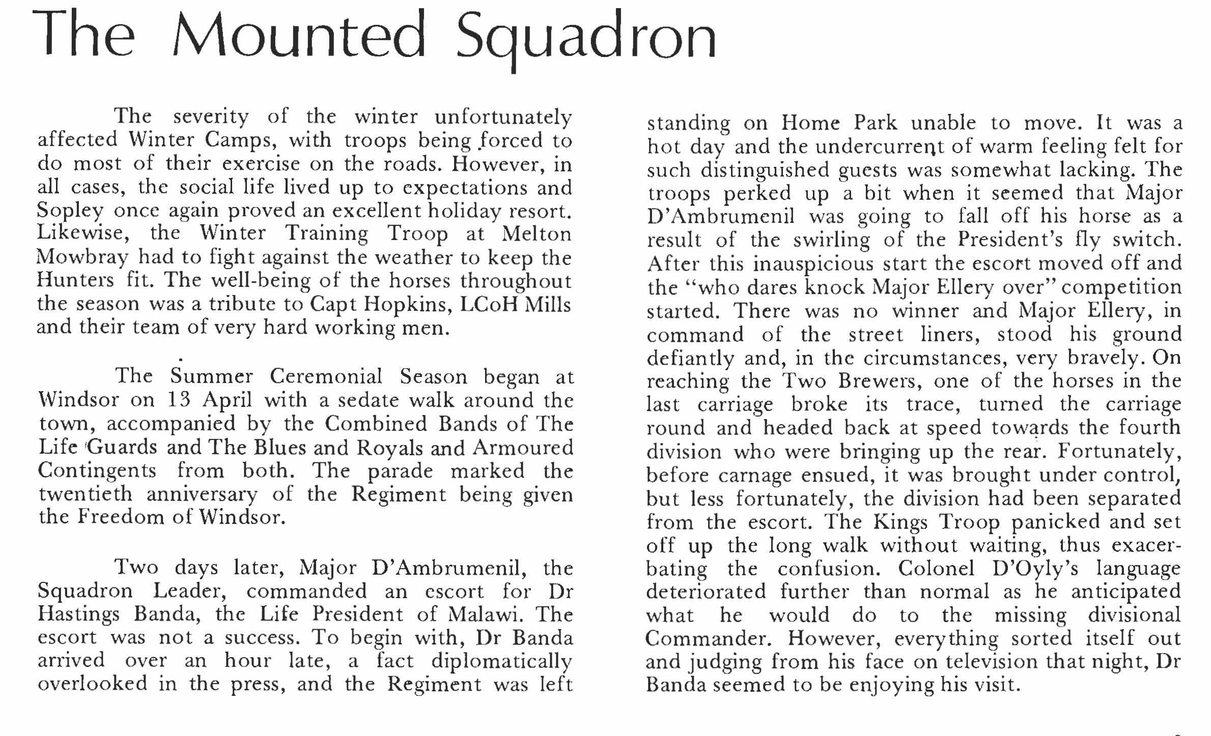 As ,ever, the Squadron has deployed nationwide in support of the Regiment and has usually simultaneously been in charged of the EHC, for which it is not established! The new ex-IG Brigadier Corbett's initial visit preceded an April week which saw the Freedom of Windsor Parade and the President of Malawi's State Visit. May saw us in Pembrokeshire for a week followed by a weekend at Chepstow as the Regiment drove home. Our SE District Commander, General Howlett, paid us a farewell visit in June before we hosted the Regimental Association and ran the Open Day. July was spent on Salisbury Plain where again we were stretched between support for the Regiment and Evacuees. After block leave in August, we split between Sennybridge and Stanford on Exercise Brave Defender, returned in time to bid farewell to Major General Commanding the Household Division, and at the time of writing are poised to perform our now well-rehearsed and demanding double act in Northumberland on Exercise Purple Victory.
