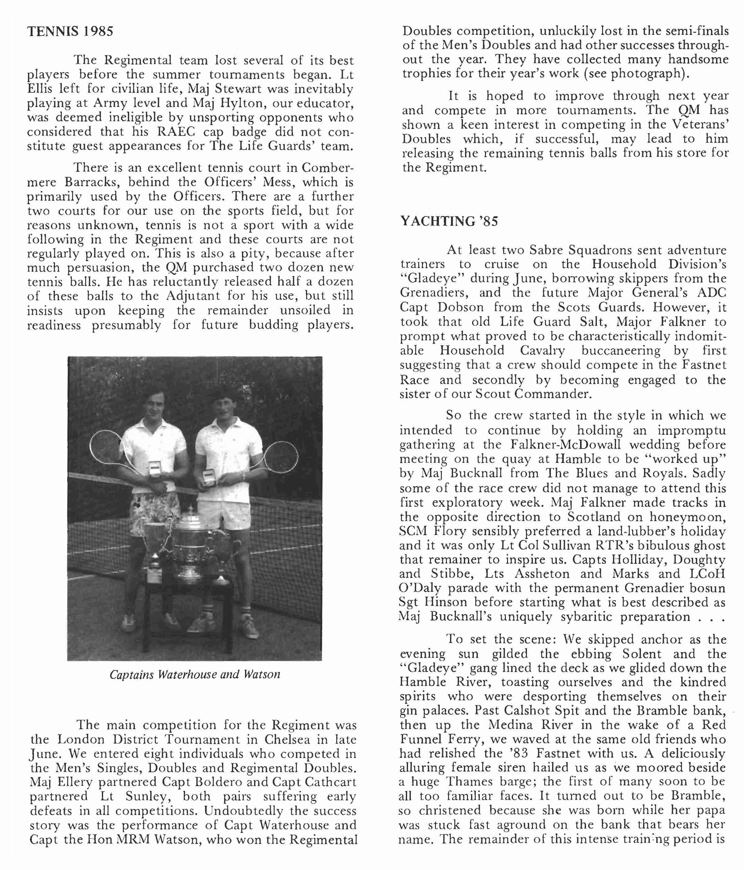 On the sporting side the accent has been our maximum involvement at all levels including interSquadron competitions in every major sport but this has not detracted from the traditional gladiators' achievements. Our Bisley team was once again in the first ten, winning the Falling Plates competition to the consternation of many of our infantry friends. Our rugby team reached the finals of the London District competition, only losing to the 1st Bn Coldstream Guards in extra time; whilst our novice boxing team won through to the London District finals. Finally, we have some notable individuals who have competed successfully through the year. 2Lt Mahoney has been selected for the 1988 Modern Pentathlon Olympic Squad after a very successful year. CoH Margan has represented the army and the Country in Fencing, and has every chance of a Commonwealth Championship place in 1986. Tpr Leeson was a junior Army Squash player this year and we are hopeful of continued success in the future.