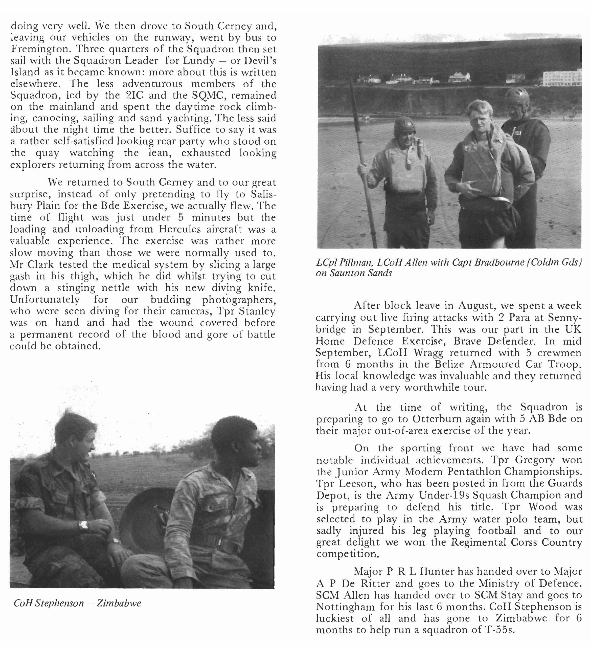 Leader in February. In April SQMC Cruddance handed over to SQMC Flory, who in turn handed over to SQMC Lodge in Noveplber and is now the SCM of the Mounted Squadron. Mr Oswald was posted to the Guards Depot in April, to be replaced by Mr MitfordSlade, who arrived in May in time for annual firing. The Squadron 2IC, Capt Marlow-Thomas, left the Army in August and is now working for Bass Charrington Breweries, where he is currently managing 24 pubs! Capt Dyson returned from Operation Raleigh and took over as 2IC. Mr SmythOsborne, presently reading for a degree at St Andrews University, joined the Squadron for the Brigade Concentration, and became very much aB Sqn man. Lt Cape returned with his Troop from Belize and is now at Melton Mowbray attending the Long Equitation Course. CoHs Wise and Lewis were posted to the Guards Depot and Royal Yeomanry respectively and CoH Gilbert is now SQMC of the Mounted Squadron. Finally Major Sampson handed over to Major Bayley in October, who has taken the Squadron to Cyprus.