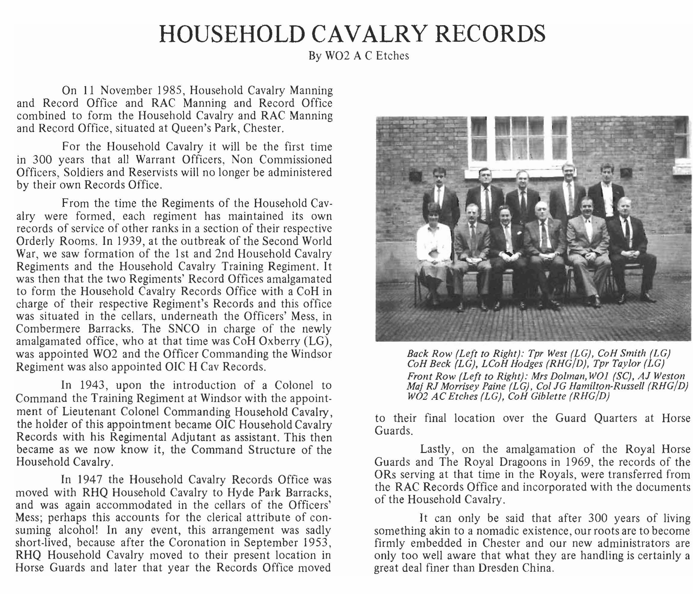 The appointment of Superintending Clerk Household Cavalry was introduced on 22 May 1944 with the rank of Warrant Officer Class I and those who have held this appointment are as follows: