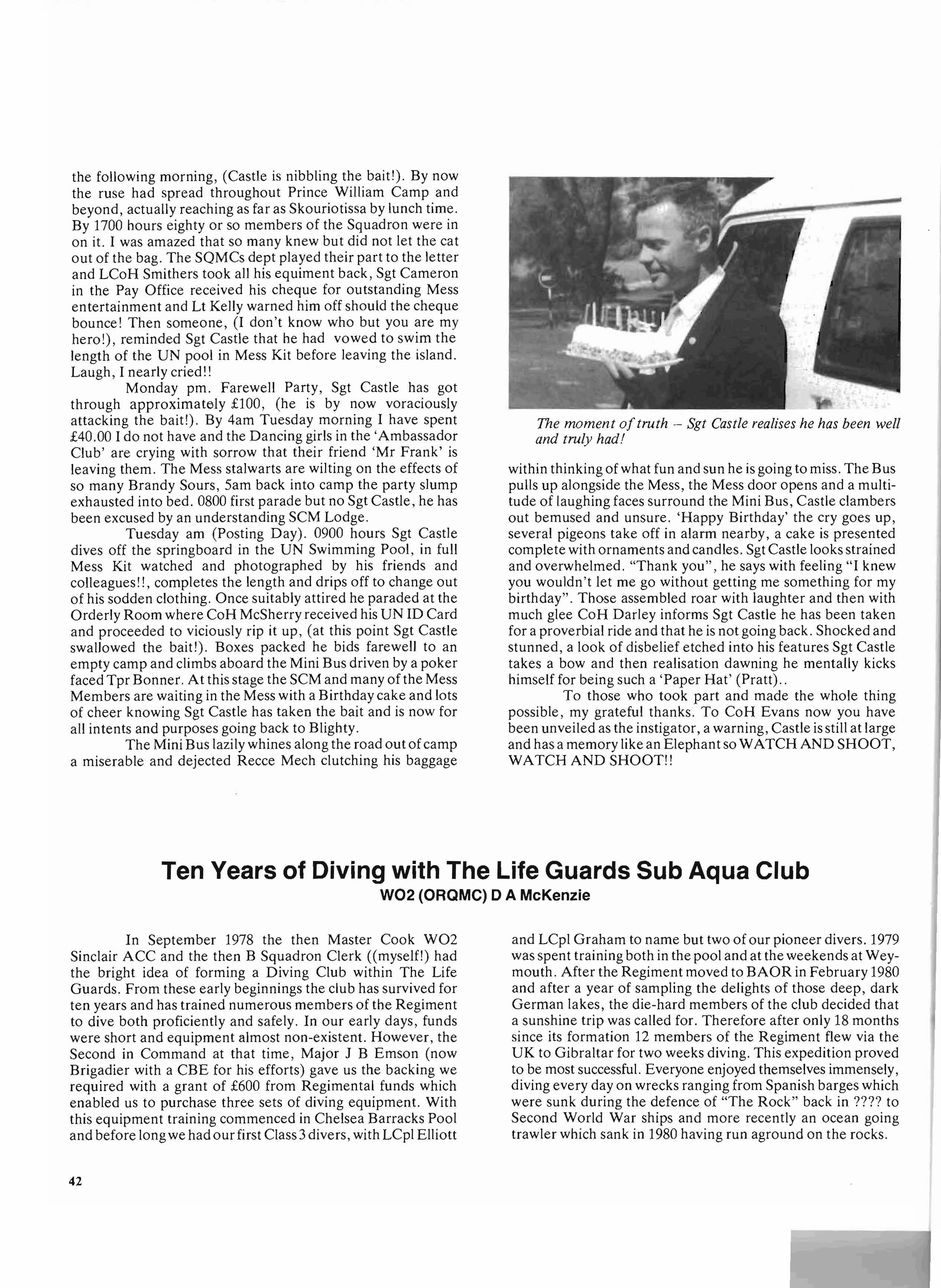 and Sgt Castle, and a host of others kept us laughing. The revue put on at the end of the tour was a scream, although some of the content would have made Bernard Manning blush. Of the memorable catchphrases let full ramming speed be adopted as A Squadron's battlecry. An example of a 'wind-up' is included as a separate item. It all had to end sometime, and in early July, just as it became lODOC we handed over to D Squadron 9/12L. We had had an entertaining and hopefuJly succesful tour thatwe will always remember. Before leaving the subject of Cyprus , mention must be made of Colonel James Hamilton-Russell (RHGID) who was the British Contingent Commander. He and his wife Alison were kind and generous to all, which was greatly appreciated by us and the whole of UNFlCYP. Things did not slow down on return to England. The Squadron has been out of barracks on exercise for 6 weeks in the period of September to November. First to Salisbury Plain Training Area (SPTA) for the Airmobility demonstration and then aspects of troop training. The demonstration was excellent, the show of helicopter flying and the speed and cross country performance of W arnoT, the new Infantry carrier, being most impressive. The short time spent on troop training was much needed, and just enough to set us up for EX PHANTOM BUGLE, in support of the Tactics Wing at Wanninster. After observing and hiding, withdrawing then attacking, byhook or by half-traok we got the vehicles back to Windsor. Now our attention twned to gunnery and Castlemartin, the 'tank' ranges in Wales. The firing period went less well than hoped. The conspired against us depriving us of one day, and we lost the last hour of firing to bad light at the end of each da y, both factors that squeezed us . Yet satisfacrory standards were demonstrated, and we look to build on that next year and achi.eve excellence. Watch this space.