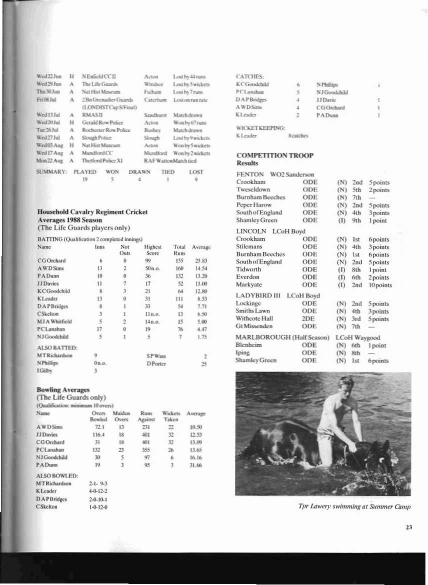 In the Squadron notes which follow you will see that 1988 has been a year of considerable variety starting with A Squadron in Cyprus with the United Nations Peace Keeping Force while the rest of the Regiment flew by Hercules without warning to exercise in Northumberland. In the early Summer we deployed on a 5 Airborne Brigade FTX; exercised with the SAS in Scotland and then later as a 'Battalion' escorted and guarded the US Air Force Cruise Missiles while they 'practised' on Salisbury Plain. The Mounted Sq uadron provided escorts for HM The Queen at the State Visits of King Olaf of Norway and the Presidents of Turkey and Senegal, and held their Summer camp at Thetford for the first time. We paraded on the Square for Colonel Lord Michael Fitzalan Howard and invited him to judge our Inter Sq uadron Drill Com petition to compensate for the lack of a street lining commitment in Windsor (there are 00 State Visits in Windsor while the Castle is being rewired). In the Autumn and Winter we fired our guns at Lulworth and Castlemartin, converted to the new rifle (SA80) and despatched a composite half Squadron to Belize in support of 1st Battalion Irish Guards. And as I wri te these notes C Squadron, with a Troop of Grenadier Guardsmen under command, prepares for its second tour in Cyprus. A full year indeed and one which has been punctuated by sports competitions of a very high standard, albeit none of the excellence which powered Lt Mahony to gain a Bronze Medal for Britain in the Olympics at Seoul.