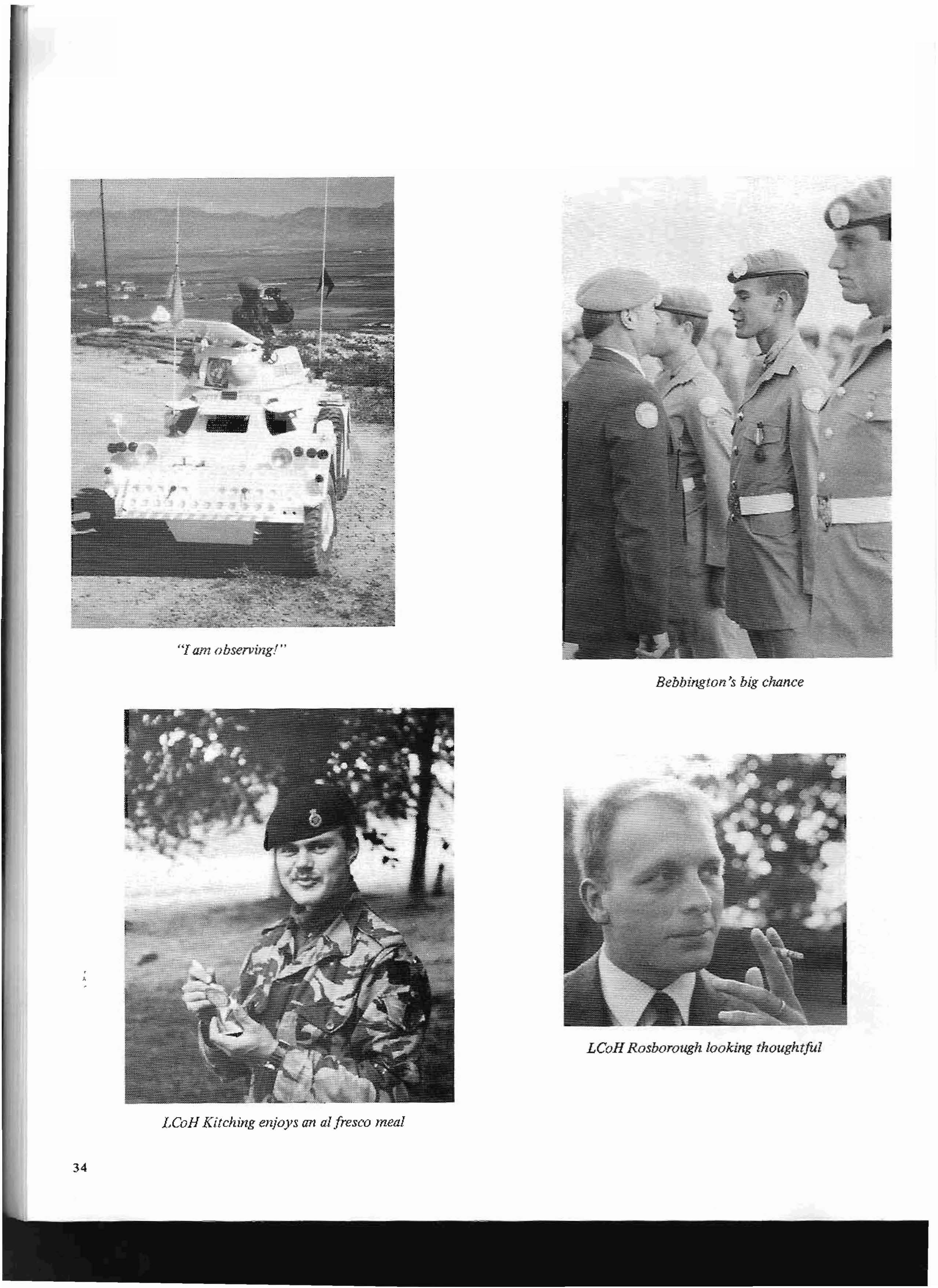 Turkish intervention), and we marched on to join them. At the end of the parade we mounted up, all started up (touch wood), wheeled away down the runway and then dashed past the saluting dias in column of troops. Also on parade were the Band who had come out specially for the parade. During their time on the island we used them to soothe the other contingents. The Band played at Skouriotissa, the Ledra Palace Hotel and at OP AlD. Togetherwith the Band of the King's Own Royal Border Regiment and the Drums Platoon of 2nd Bn Coldstream Guards they put 00 an excellent concert at the amphitheatre at Curi\llU. OUf least expected visitor was Mr Gordon Honeycombe. He is putting together a pictorial book about the Household Cavalry, and came to gather ideas. These will be put into practice by C Squadron.