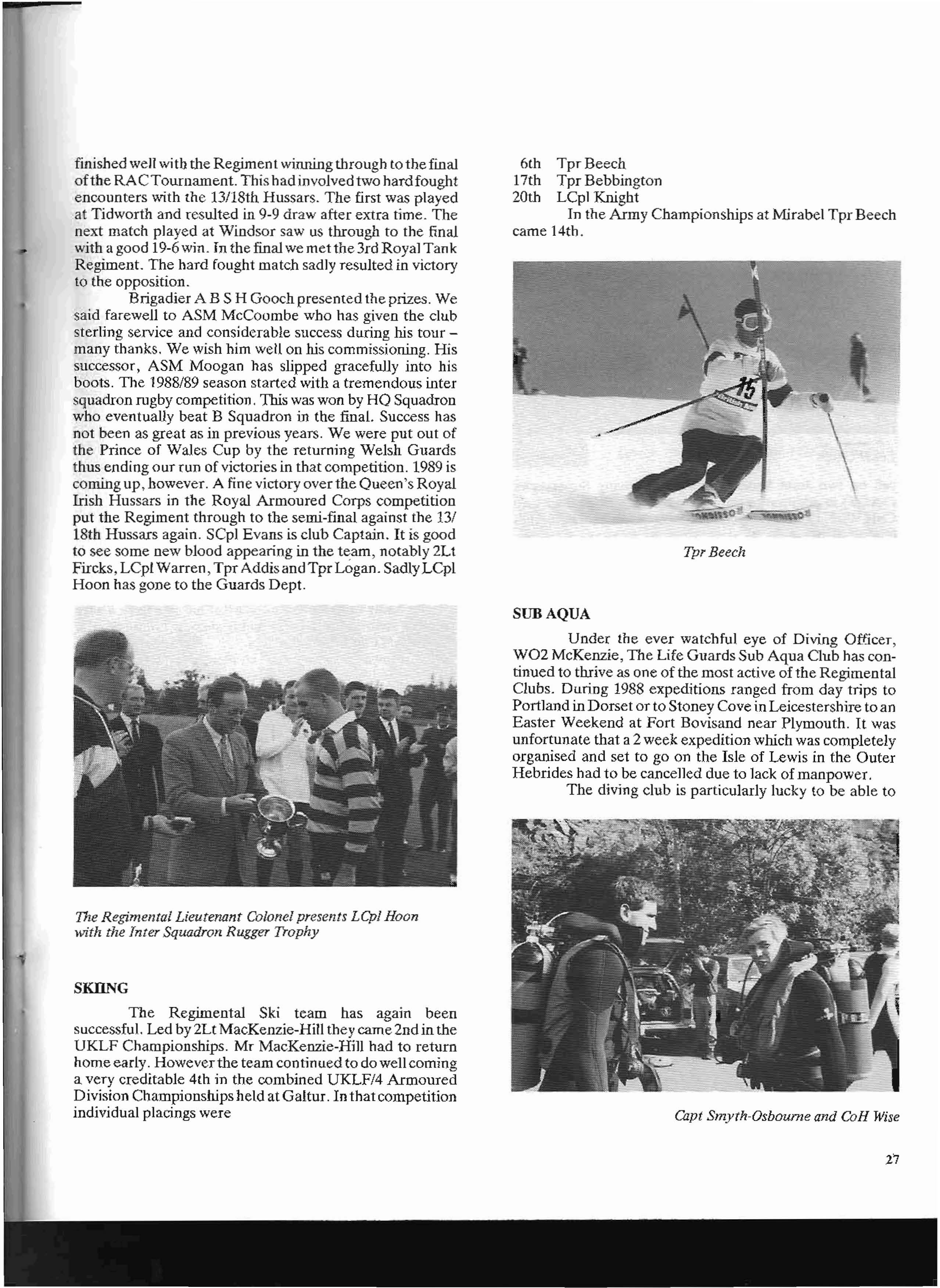 Even some gladiators of the past were brought out of retirement to play for the Squadron. W02 Byrne who hung up his boots some years ago was brought out of retirement to represen t the Sq uadron at Rugby. He proved to B Squadron that he had not lost his flare, sidestepping to score a try in the final. The achievements this sporting year have been tremendous, culminating in the presentation of the Inter Squadron Sports Trophy to the Squadron Leader at the Boxing Competition by The Lieutenant Colonel Commanding The Household Cavalry.