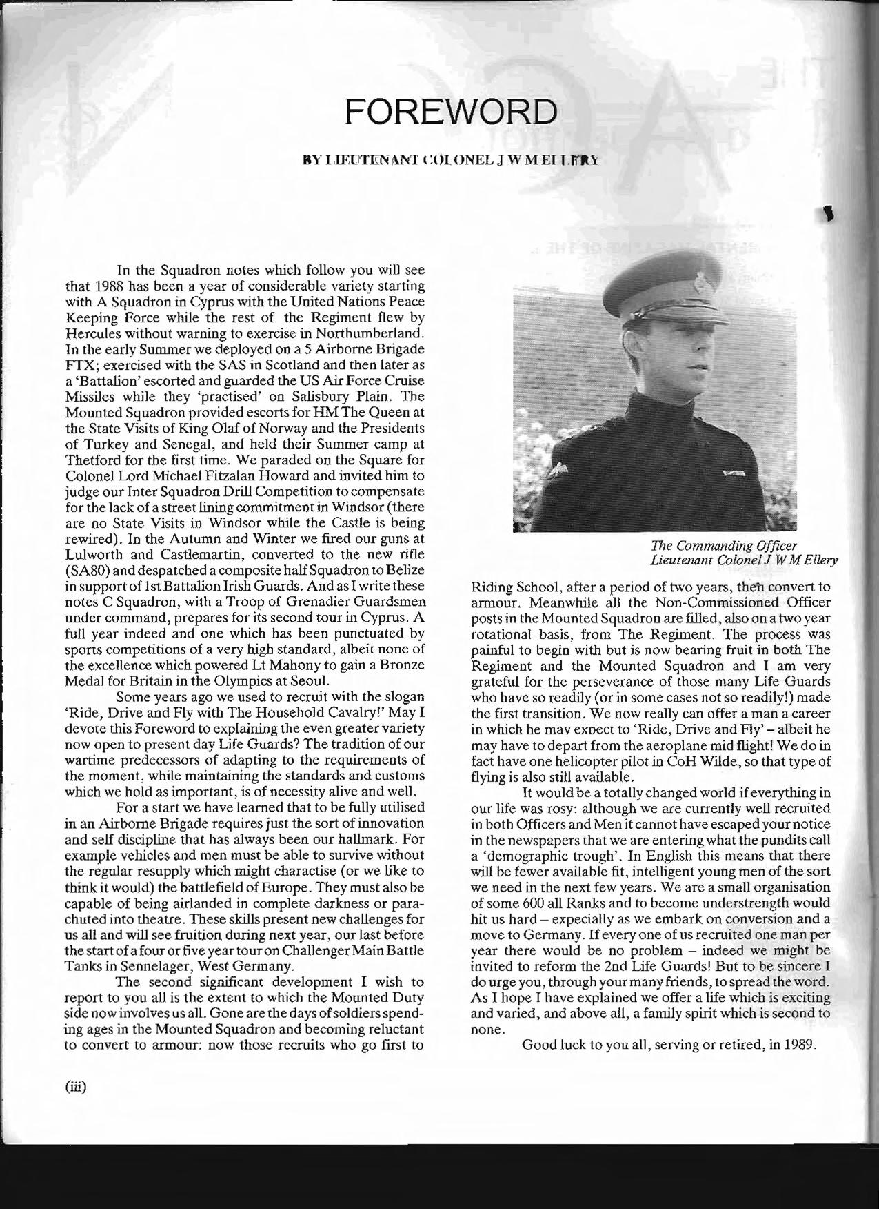 Some years ago we used to recruit with the slogan 'Ride, Drive and Fly with The Household Cavalry!' May I devote this Foreword to explaining the even greater variety now open to present day Life Guards? The tradition of our wartime predecessors of adapting to the requirements of the moment, while maintaining the standards and customs which we hold as important, is of necessity alive and well.