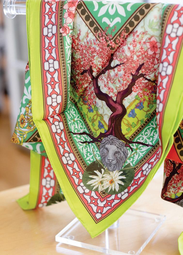 At first glance, these silk scarves are simply a lovely adornment to any spring wardrobe or accessory but take a closer look and you’ll spot a few familiar details, like the vibrant cherry tree in full bloom, the cabin, or the lion’s head feature found throughout the estate.