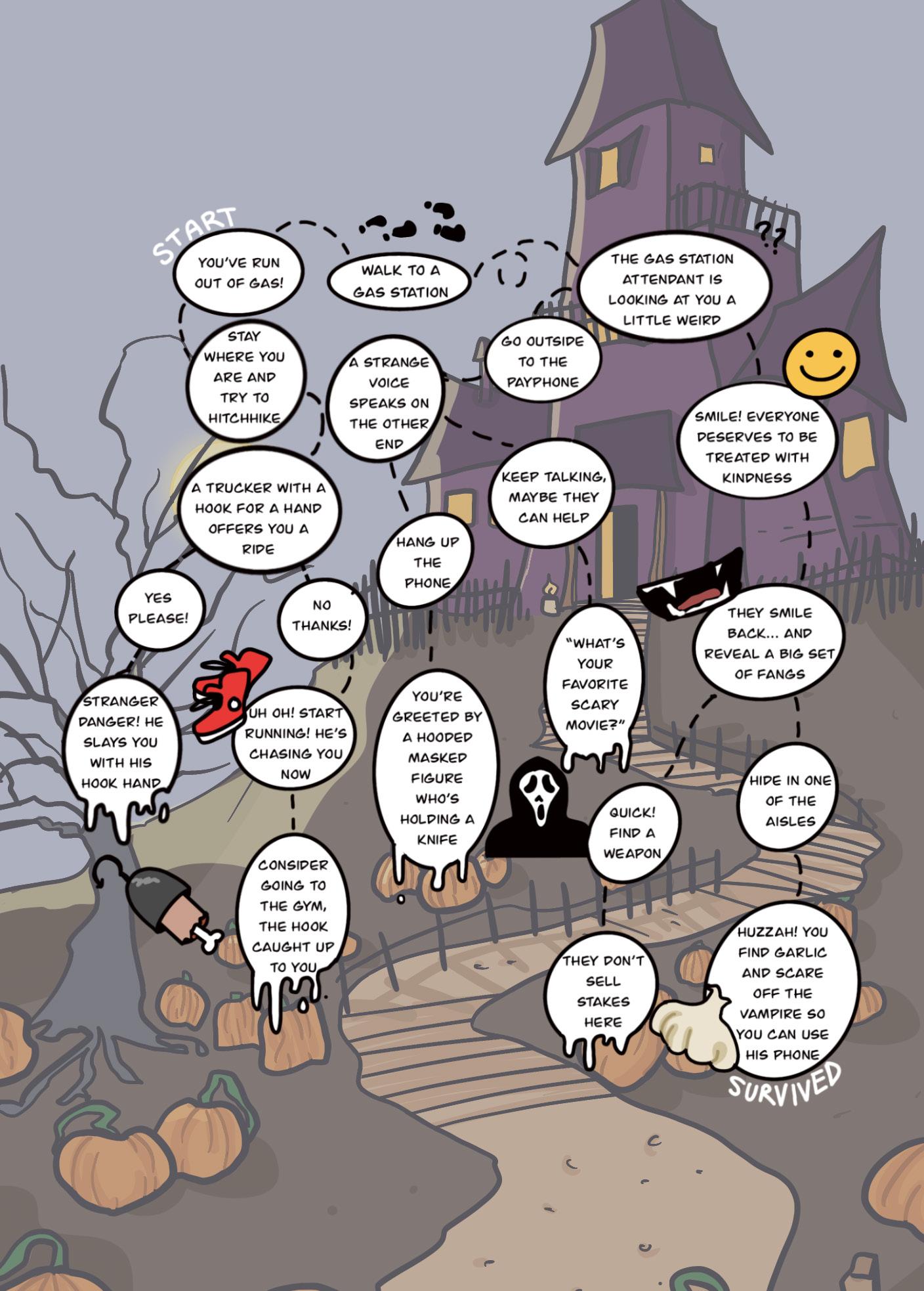 have people wondering: “would I survive a horror movie?” Here’s a quiz to find out. Start with empty gas and follow the dotted lines based on what you feel you would do in that situation. Make the right choice. Illustrations by J. Le