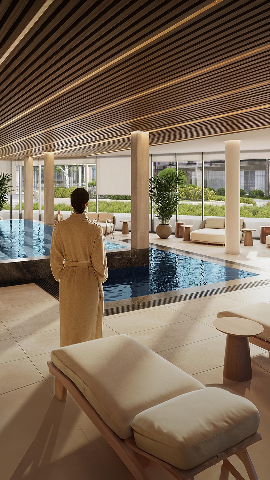 The building features a spacious entrance lobby, which includes the reception area, security, and dedicated space for mailboxes, as well as a pet station and dedicated storage space for strollers. A bike room is located on the ground level near the garage entrance. The underground car park facility offers single-level parking with 141 spaces (96 for residents), while the ground floor features retail area and provides residents with all necessary amenities and services. Ground floor also features a luxury spa with a swimming pool, sauna, and jacuzzi. Storage rooms are provided for two, three and four bedroom apartments, some on the residential levels and others in the underground area.