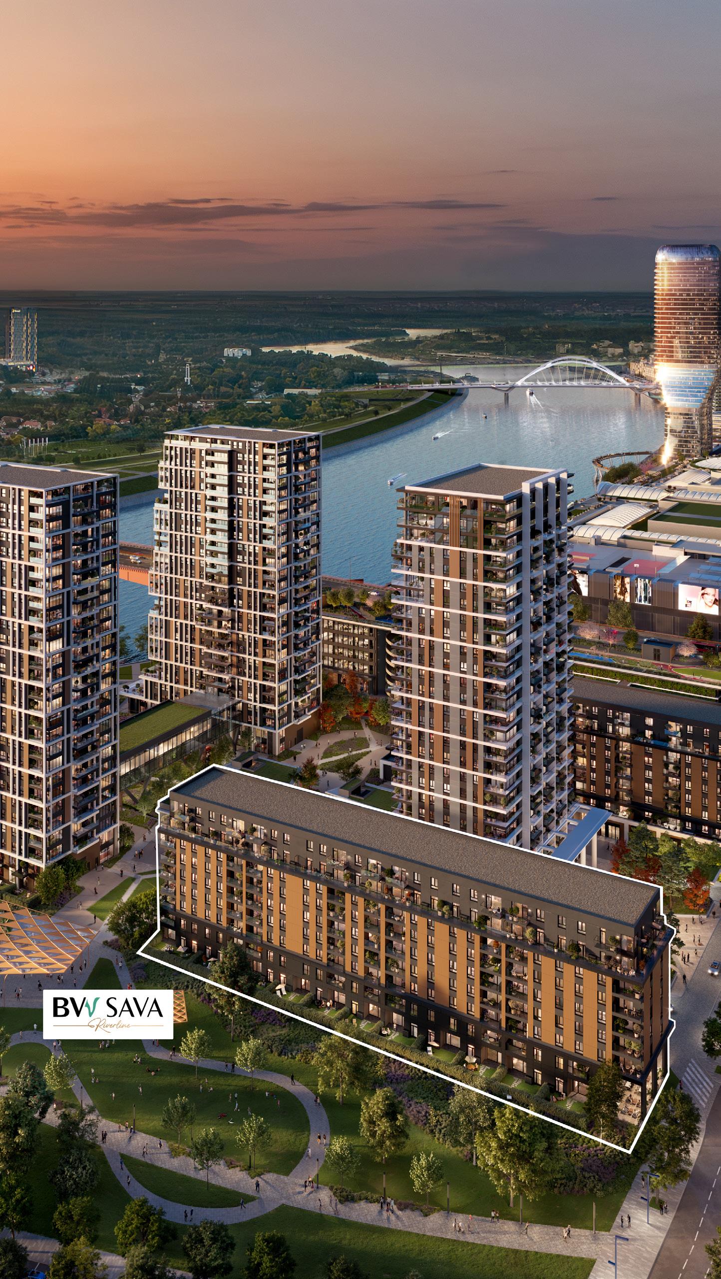 BW Sava is a premium smart 8-storey residential building located within the Riverline mixed-use complex that overlooks the Sava River. The plot is bordered by the Sava River, the Woodrow Wilson Boulevard, the Linear park and the Gazela Bridge. The complex comprises four other residential buildings, which encircle a landscaped courtyard, along with an office building that acts as a buffer from the Gazela Bridge, and features a car park facility, as well as a rooftop garden with sports and recreation amenities.