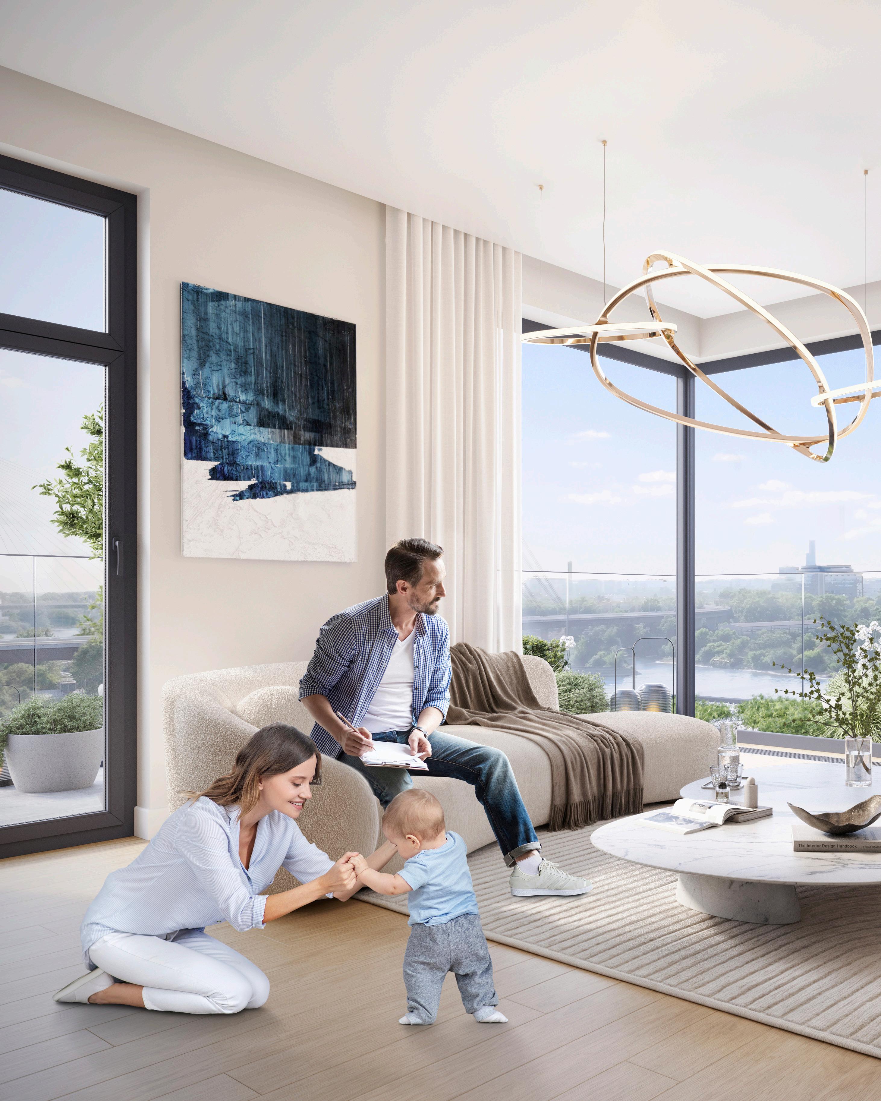 prostore i obilje prirodnog svetla, stvarajući osećaj udobnosti i blagostanja. Visine plafona se kreću od 250 cm u kupatilima do 260 cm u hodnicima i 280 cm u dnevnim i spavaćim sobama, što dodatno pojačava osećaj prostranosti, dok terase u svakoj stambenoj jedinici sadrže prozore od poda do plafona koji pružaju celodnevnu sunčevu svetlost. U zavisnosti od orijentacije, stanari mogu uživati u divnim pogledima na lepo uređeno unutrašnje dvorište, zelenilo Linijskog parka, pešački i biciklistički most, reku Savu i okolne zgrade.