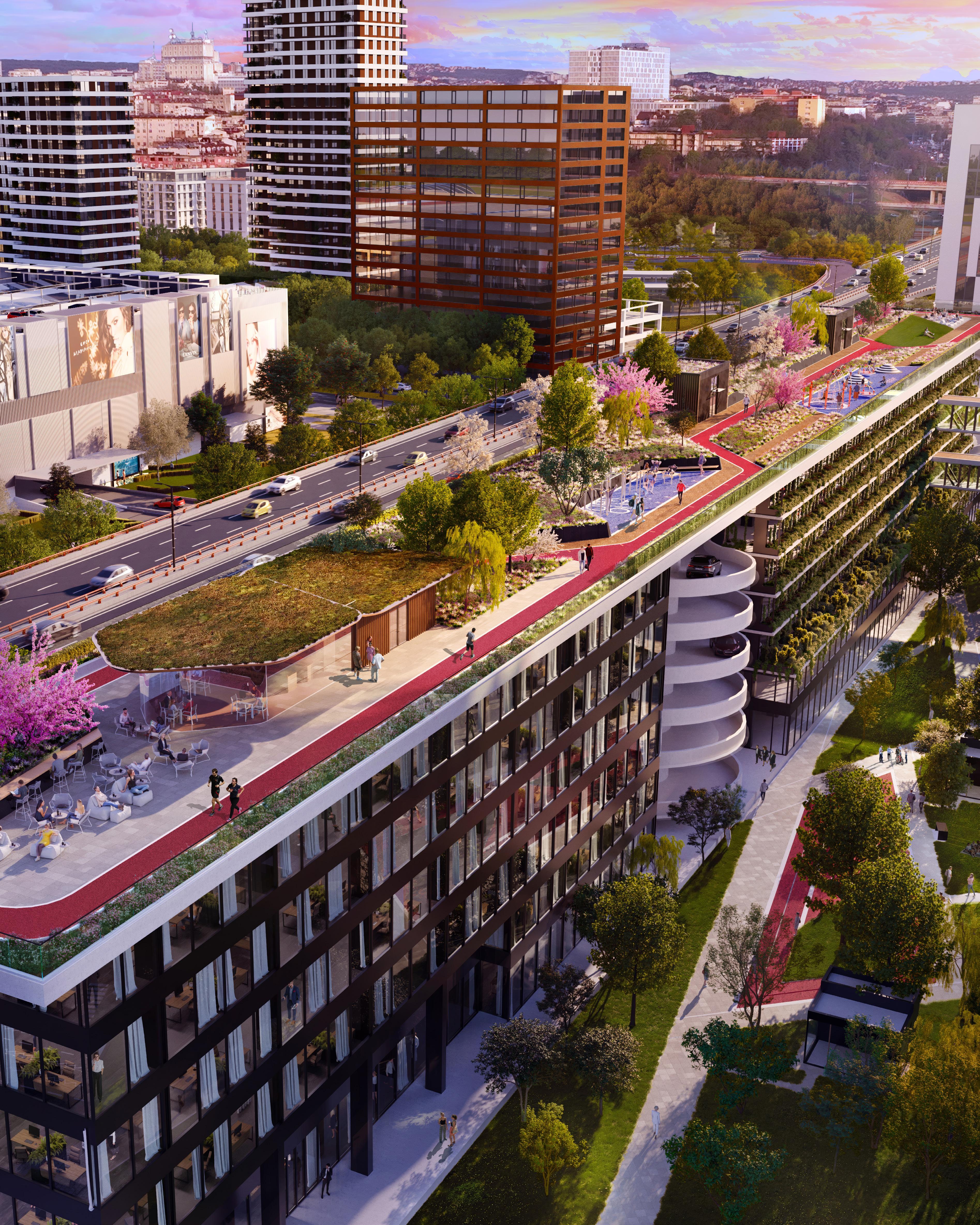 Zgrada poseduje prostrani ulazni hol sa recepcijom, obezbeđenjem i odvojenim prostorom za poštanske sandučiće. U prizemlju se nalaze maloprodajni i ugostiteljski sadržaji sa pogledom na lepo uređeno unutrašnje dvorište koje je direktno povezano sa susednim parkom, kao i namenske skladišne prostorije za bicikle i stanica za kućne ljubimce. Ispod zgrade smeštena je zajednička podzemna garaža na jednom nivou sa 149 parking mesta.