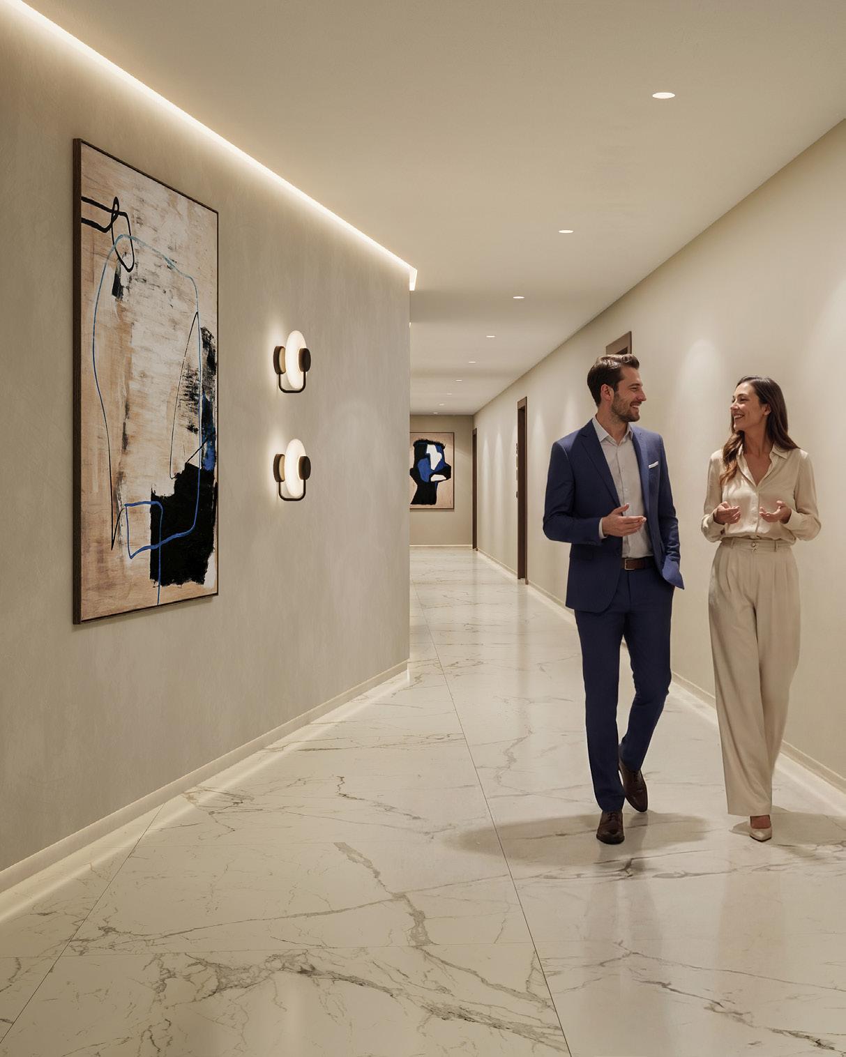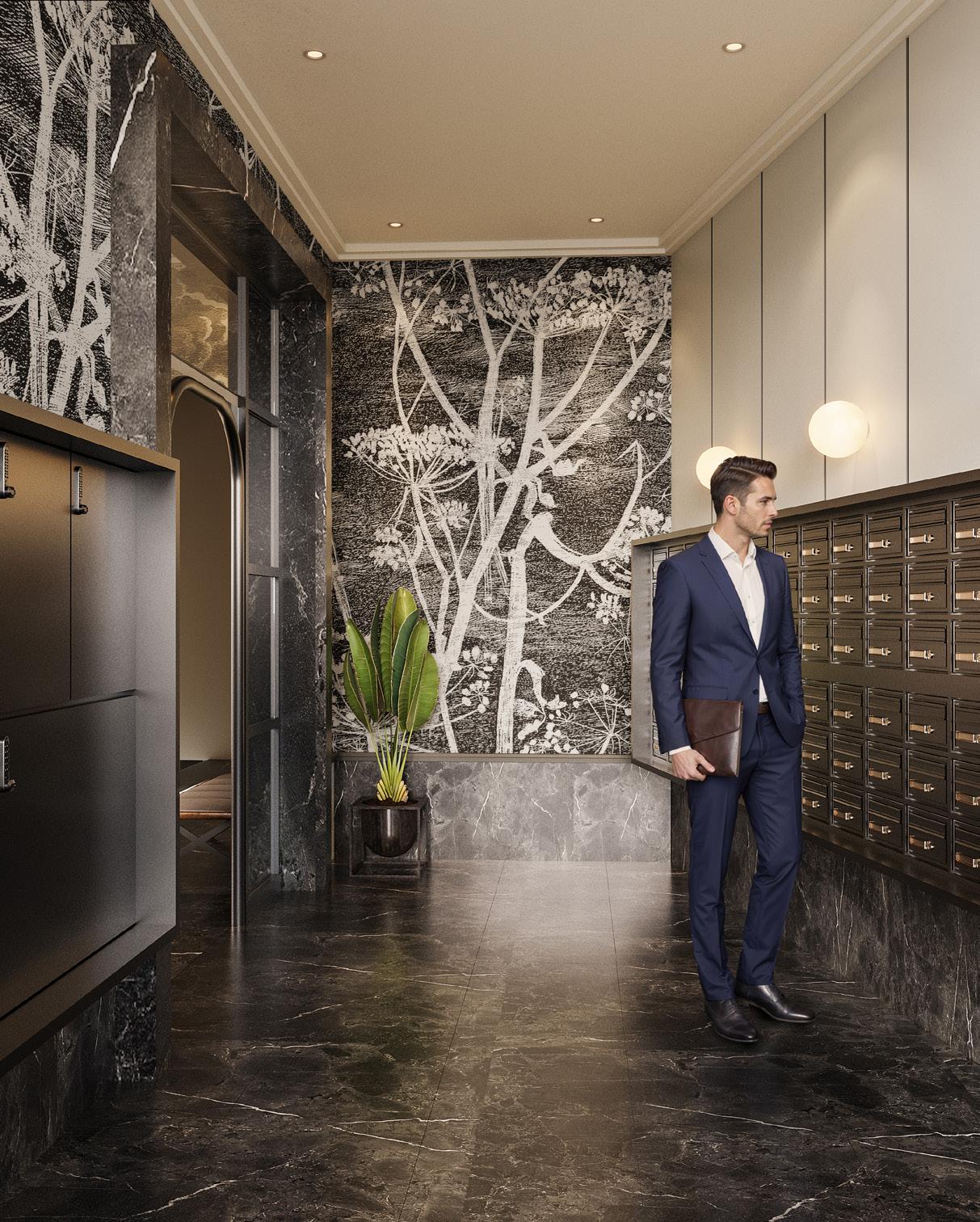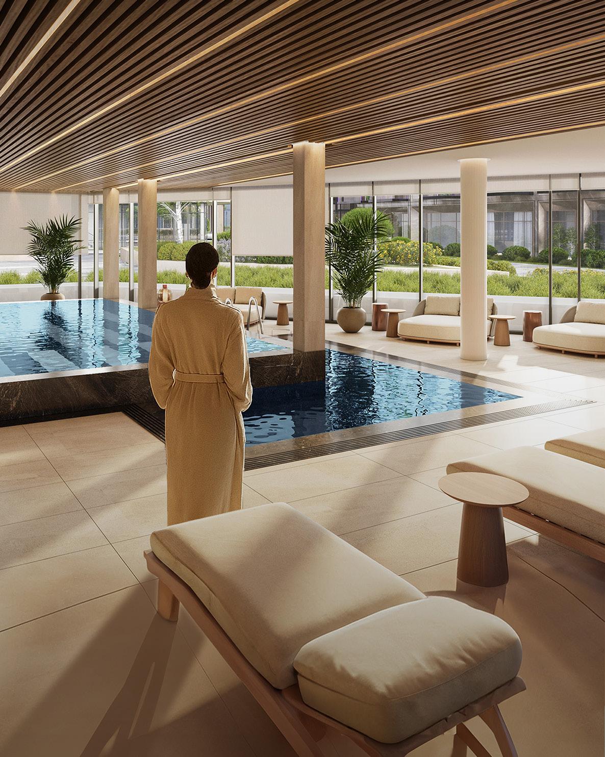 The building features a spacious entrance lobby with a reception and dedicated mail area, complemented by a pet station, bicycle storage, and stroller storage. The ground floor offers retail space and essential amenities, while residents also have access to a luxury spa with a swimming pool, sauna, and jacuzzi in the neighbouring BW Emerald building.