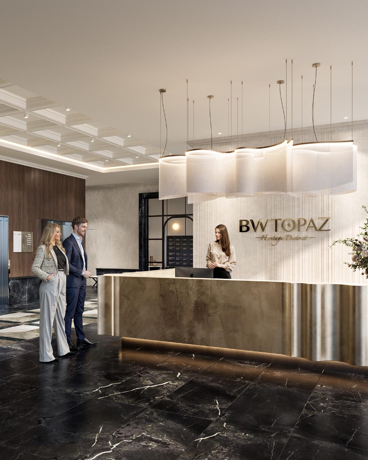 BW Topaz is a premium residential complex in Belgrade Waterfront’s exclusive Heritage District. Nestled in the vibrant Savamala neighbourhood near the riverside, it occupies a prime position in the immediate vicinity of the historic Belgrade Cooperative building. This low-rise, boutique-style development comprises 84 elegant apartments organised around two wings, accessed via a shared grand lobby with reception. The main six-storey wing contains 72 units, while the secondary two-storey wing has 12. The ground-floor lobby opens onto Hercegovačka Street, with an additional entrance from the landscaped inner courtyard, surrounded by other low-rise residential and commercial buildings.