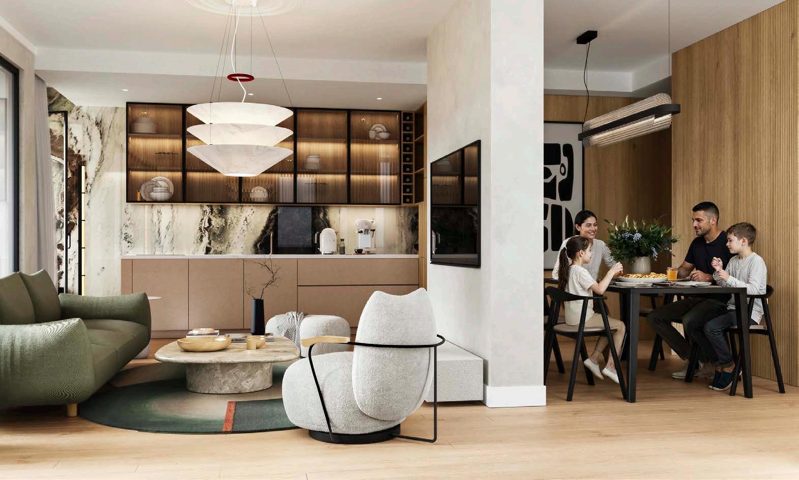 The immediate proximity to linear park, a contemporary market, and recreational zones naturally encourage movement, time spent outdoors, and a healthier lifestyle, while sustainable design solutions help reduce the project’s carbon footprint and promote a responsible relationship with the environment.