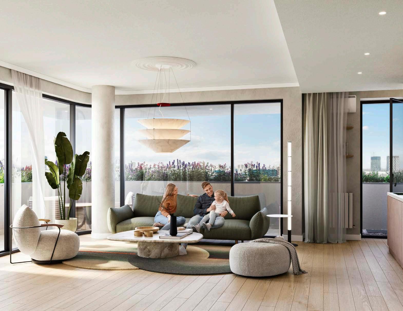 Green terraces, with integrated planters and areas for plants and herbs, transform outdoor spaces into a natural extension of the interior, restoring a meaningful connection with nature. Visual links to the park and the river further enhance the sense of openness and tranquility.
