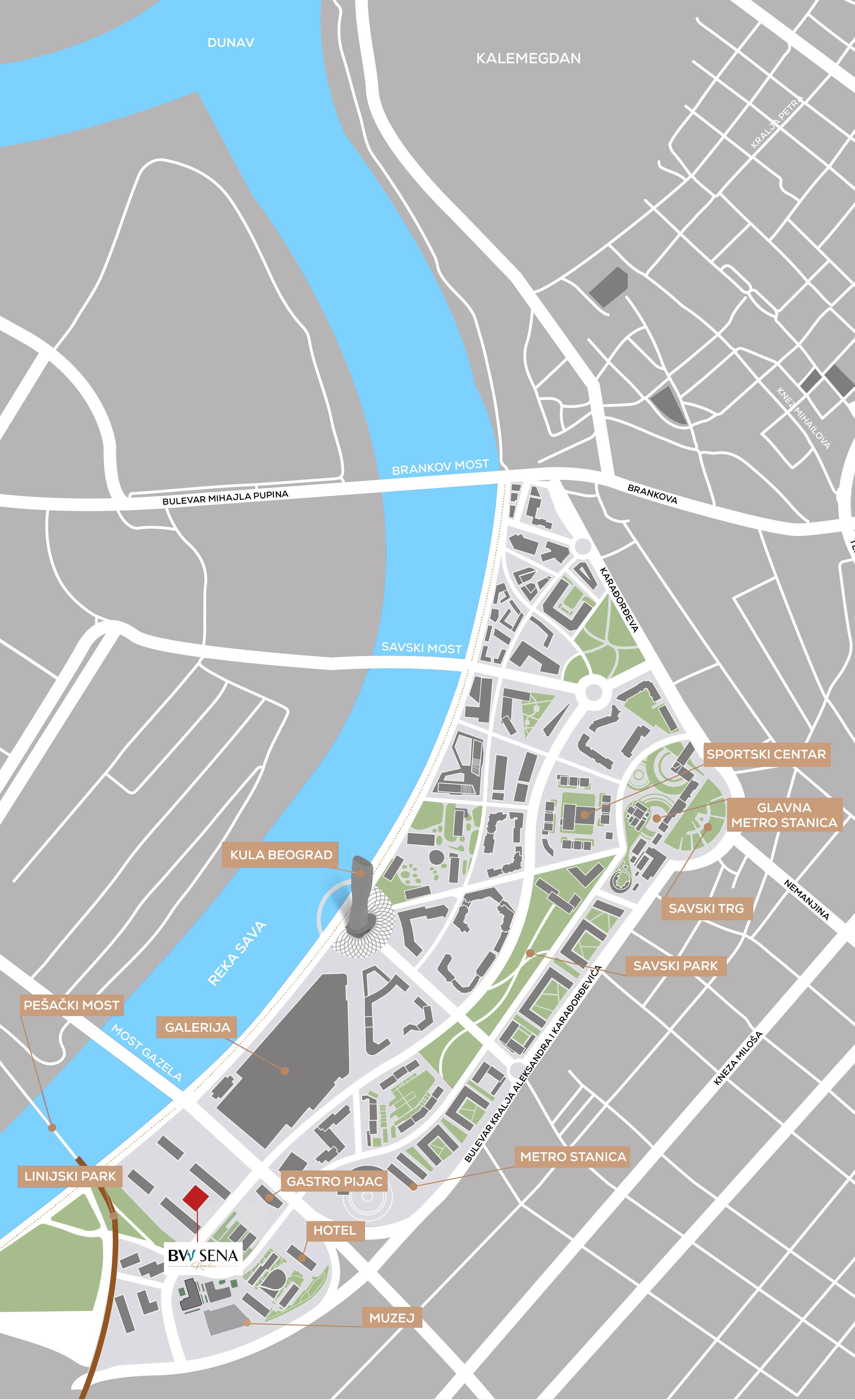 Beograd na vodi je urbano okruženje koje objedinjuje stanovanje, rekreaciju, kulturu i šoping ponudu. Upravo na takvom mestu okruženom zelenilom, BW Sena zauzima centralni deo, na lokaciji odakle su na samo nekoliko minuta hoda dostupni Sava Promenada, Galerija, nova pijaca Gastro pijac, park i drugi sadržaji. Njena odlična povezanost sa ostatkom grada obezbeđena je preko Bulevara Vudroa Vilsona i mosta Gazela, dok će buduće metro stanice i planirani pešački most prema Novom Beogradu dodatno unaprediti dostupnost i vezu sa svim delovima grada. Jedinstveno okruženje BW Sene obuhvata i Ložionicu, Kulu Beograd sa hotelom The St. Regis Belgrade, gastronomske i rekreativne zone, čineći svakodnevni život praktičnim i sadržajnim.