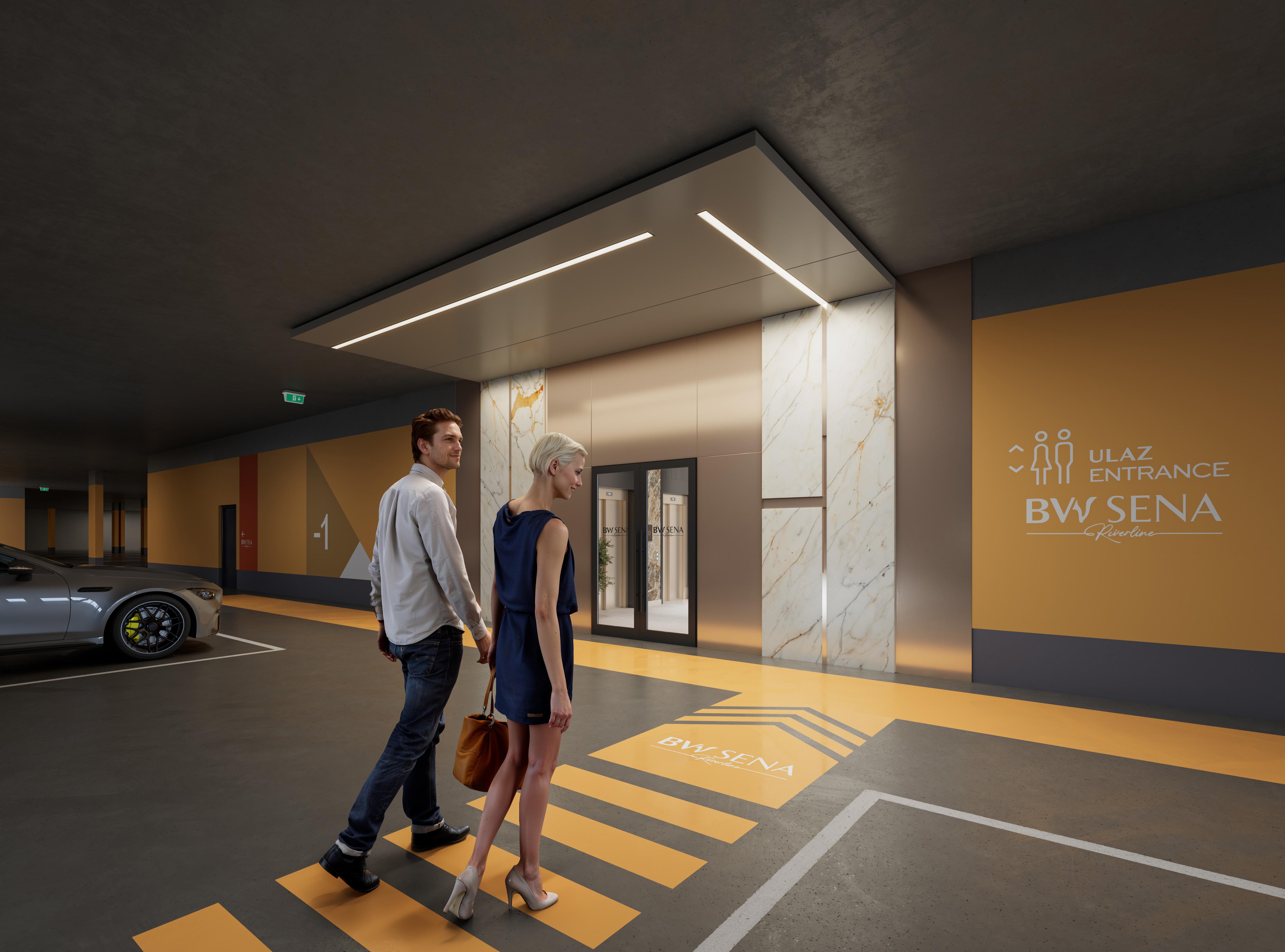 Život u BW Seni oslanja se na pažljivo planirane zajedničke prostore koji doprinose udobnosti i sigurnosti svakodnevnog stanovanja. Reprezentativni ulazni lobi sa recepcijom i obezbeđenjem pruža osećaj uređenosti već na samom ulazu, dok je ispred glavne fasade organizovana drop-off zona namenjena brzom i lakom pristupu zgradi. Parkiranje je obezbeđeno u okviru podzemne garaže na jednom nivou, koja je povezana sa ostatkom kompleksa i omogućava jednostavno kretanje stanara.