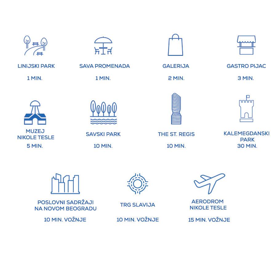Okruženje BW Sene donosi bogatu gastronomsku i šoping ponudu tokom celog dana. Na svega dva minuta hoda nalazi se Galerija – najveći tržni centar u regionu, sa više od 300 prodavnica, preko 50 restorana i kafića, jedinim IMAX bioskopom u Srbiji i raznovrsnim zabavnim sadržajima. U najbližem okruženju nalaze se i food truck zone, fine dining i casual restorani, kafići, supermarketi i različite servisne usluge, čime se svakodnevni život stanara odvija jednostavno, organizovano i bez žurbe. Smeštena u prostoru u kojem su sve ključne tačke povezane prijatnim pešačkim šetnjama: jedan minut hoda deli je od linijskog parka i Sava Promenade, dva minuta od Galerije, tri minuta od nove pijace, pet minuta od Muzeja Nikole Tesle, dok se za deset minuta stiže do Savskog parka ili hotela The St. Regis Belgrade. Do centra grada i kulturno-istorijskih znamenitosti, poput Kalemegdana, stiže se za oko trideset minuta lagane šetnje, dok su Slavija, poslovne zone Novog Beograda i međunarodni aerodrom „Nikola Tesla“ udaljeni svega deset, odnosno petnaest minuta vožnje.