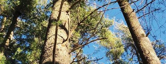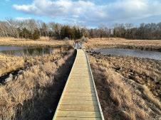 We pass 100-year-old white pines and vernal pools that may soon hold spotted salamander eggs, cross a boardwalk where signs of beaver activity can be seen in the pond, enter a clearing with a Chimney Swift nesting tower, and then, as the trail nears wetlands, we begin to see Atlantic white cedars – identifiable by their tiny green needles and striated bark gradually spiraling up the trunk – and red maples, which will be the first trees to flower in the spring.