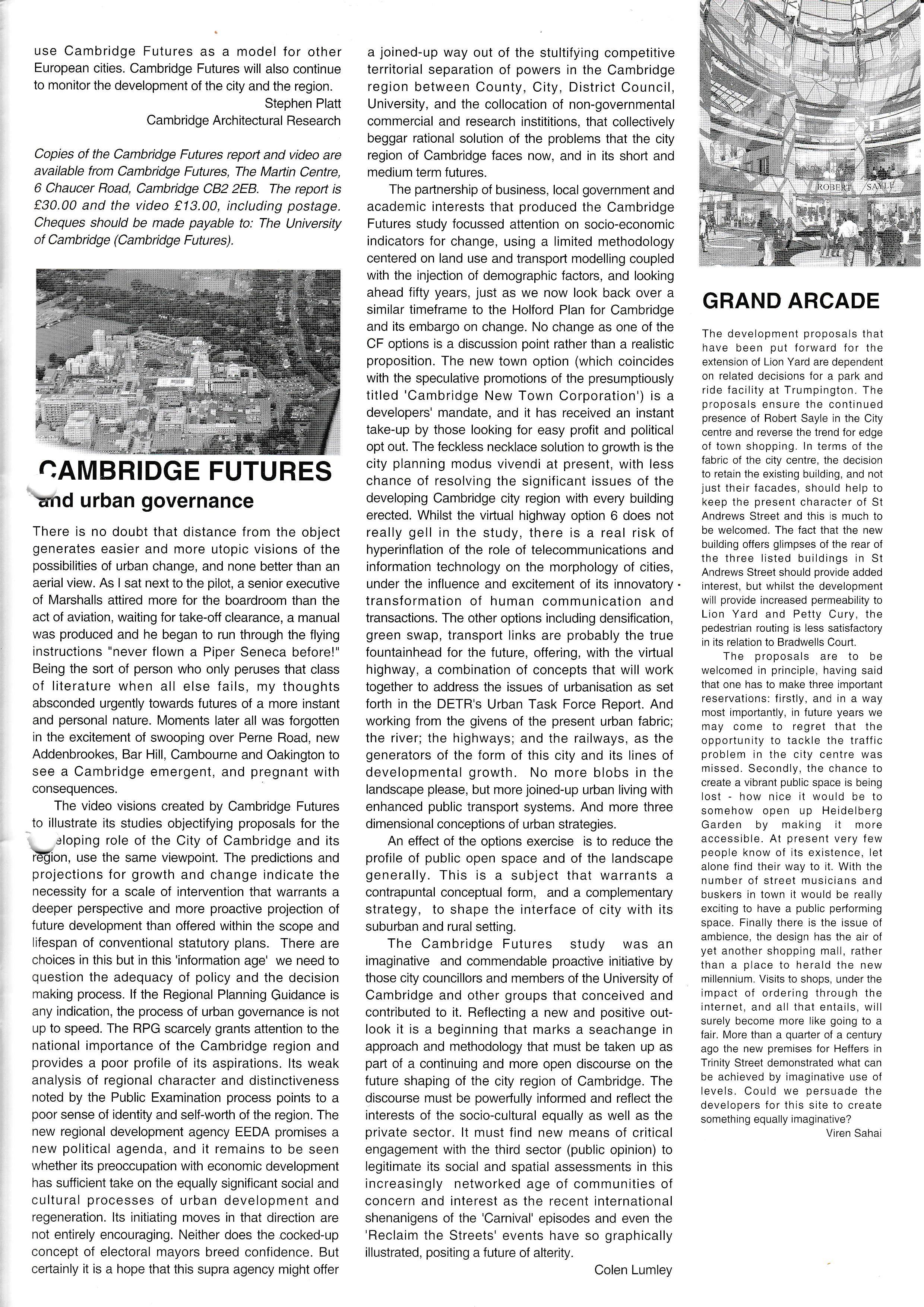 The development proposals that have been put forward for the extension of Lion Yard are dependent on related decisions for a park and ride facility at Trumpington. The proposals ensure the continued presence of Robert Sayle in the City centre and reverse the trend for edge of town shopping. ln terms of the fabric of the city centre, the decision to retain the existing building, and not just their facades, should help to keep the presenl character of St Andrews Street and this rs much to be welcomed. The fact that the new building offers glimpses of the rear of the three listed buildings in St Andrews Street should provide added interest, but whilst the development will provide increased permeability to Lion Yard and Petty Cury, the pedestrian routing is less satisfactory in its relation to Bradwells Couit. The proposals are to be welcomed in principle, having said that one has to make three important reservations: firstly, and in a way most importantly, in future years we may come to regret that the opportunity to tackle the traffic problem in the city centre was missed. Secondly, the chance to create a vibrant public space is being lost - how nice it would be to somehow open up Heidelberg Garden by making it more accessible. At present very few people know of its existence, let alone find their way to it. With the number of street musicians and buskers in town it would be really exciting to have a public perlorming space. Finally there is the issue of ambience, the design has the air of yet another shopping mall, rather than a place to herald the new millennium. Visils to shops, under the impact of ordering through the internet, and all that entails, will surely become more like going to a fair. More than a quarter of a century ago the new premises for Heffers in Trinity Street demonstrated what can be achieved by imaginative use of levels. Could we persuade the developers for this site to create something equally imaginative?