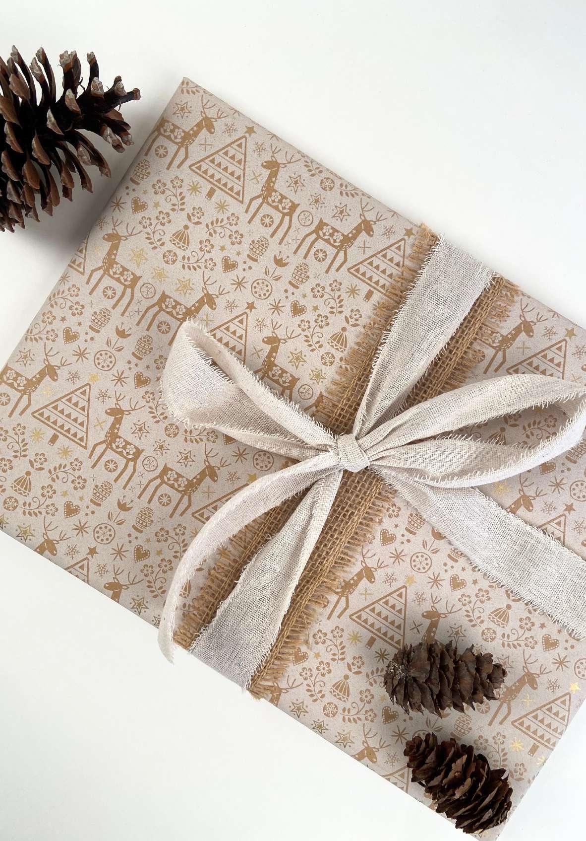 STYLED WITH TRUE GOLD SATIN RIBBON AND RIBBED KRAFT PAPER RIBBON WHITE