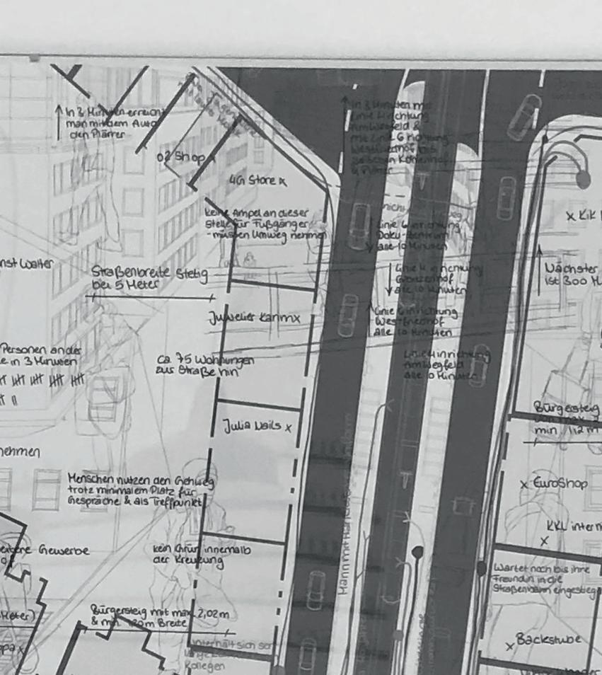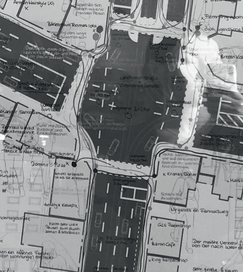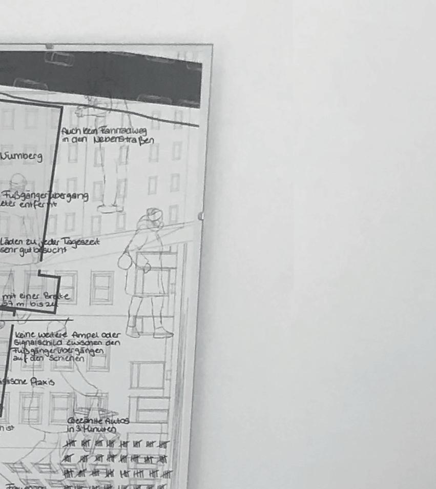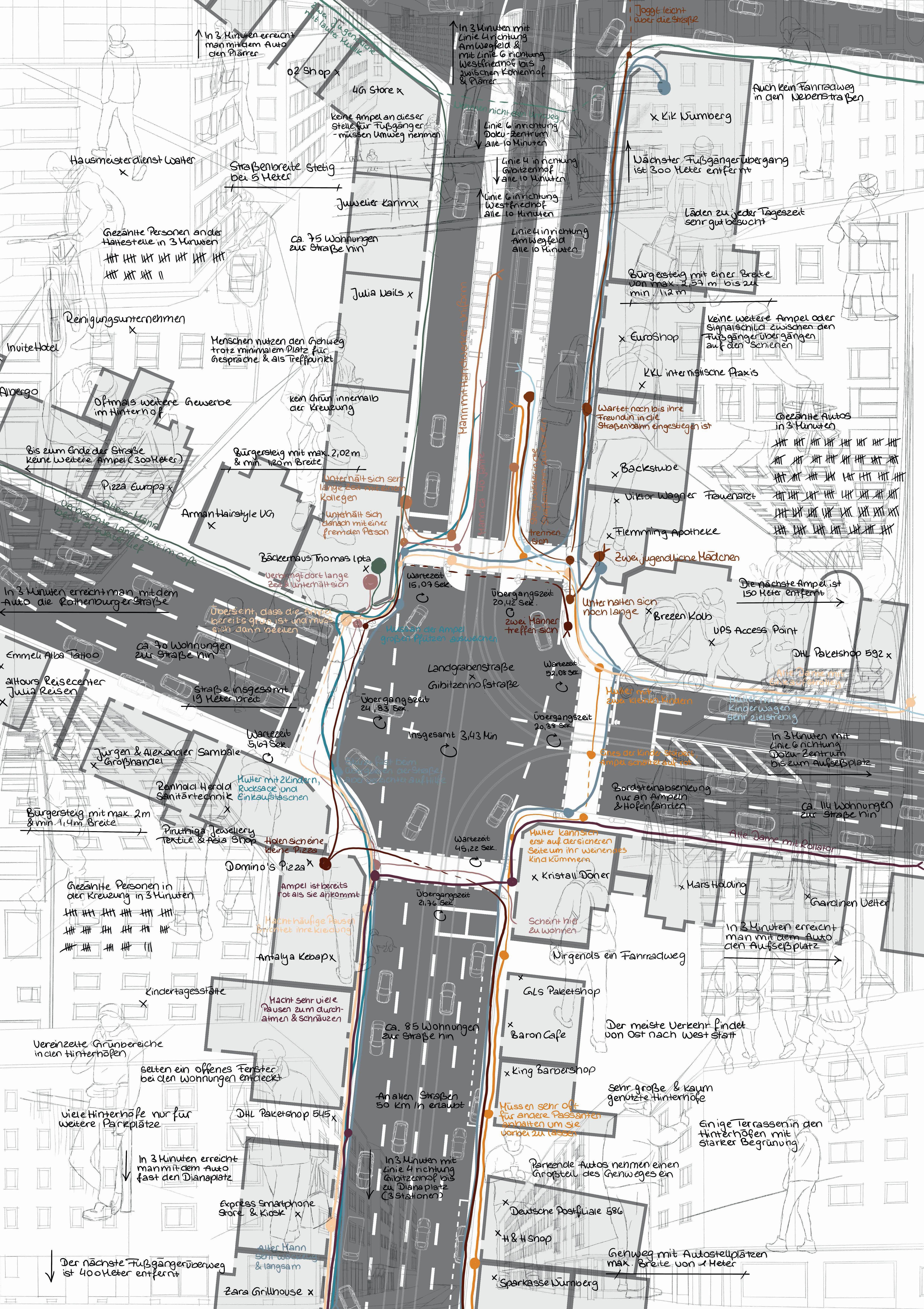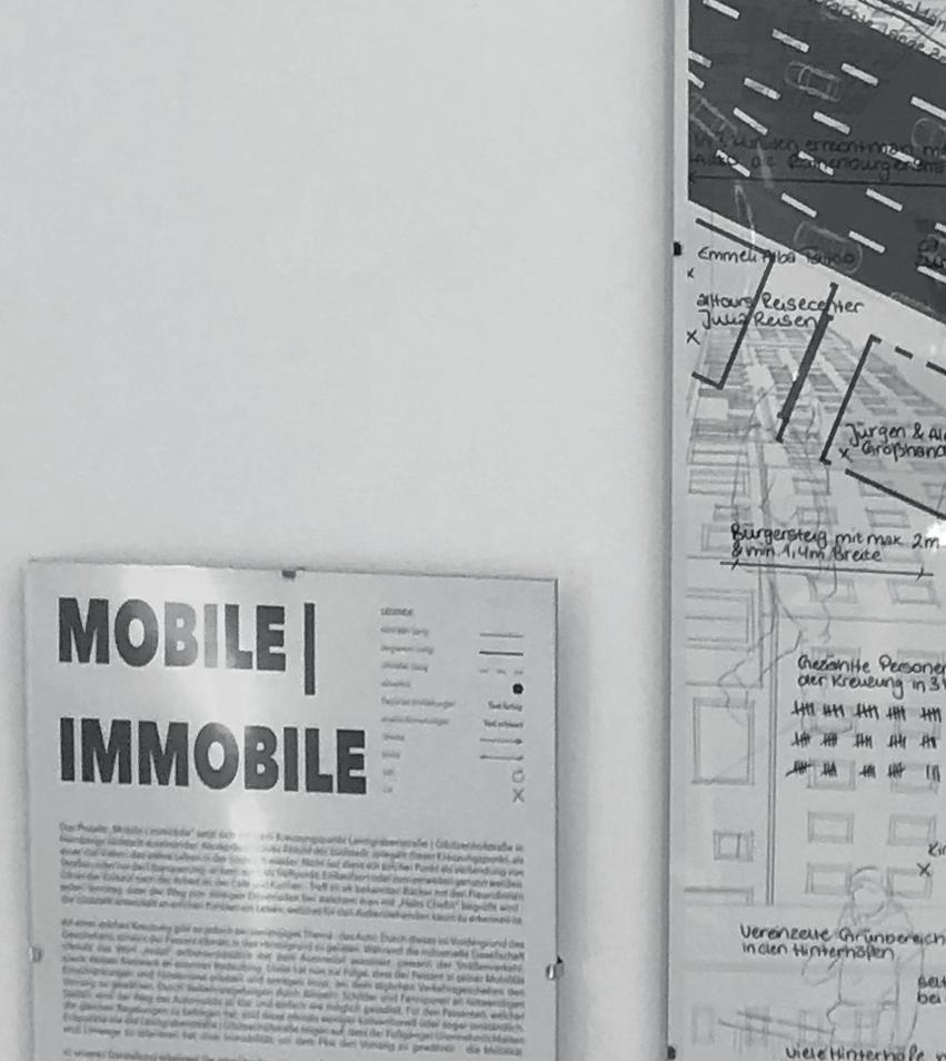 Das Projekt „Mobile | Immobile“ setzt sich mit dem Kreuzungspunkt Landgrabenstraße | Gibitzenhofstraße in Nürnbergs Südstadt auseinander. Als repräsentatives Abbild der Südstadt, spiegelt dieser Kreuzungspunkt, als einer von Vielen, das wahre Leben in der Südstadt wieder. Nicht nur dient ein solcher Punkt als Verbindung von Straßen, oder nur der Überquerung - er kann auch als Treffpunkt, Einkaufsort oder zum verweilen genutzt werden. Ob es der Einkauf nach der Arbeit ist, der Café und Kuchen - Treff im alt-bekannten Bäcker mit den Freundinnen jeden Sonntag, oder der Weg zum einzigen Dönerladen bei welchem man mit „Hallo Chefin“ begrüßt wird - die Südstadt entwickelt an solchen Punkten ein Leben, welches für den Außenstehenden kaum zu erkennen ist. An einer solchen Kreuzung gibt es jedoch ein vorrangiges Themadas Auto. Durch dieses im Vordergrund des Geschehens, scheint der Passant oftmals in den Hintergrund zu geraten. Während die industrielle Gesellschaft oftmals das Wort mobil selbstverständlich mit dem Automobil assoziiert, gewann der Straßenverkehr, sowie dessen Netzwerk an enormer Bedeutung. Diese hat nun zur Folge, dass Fußgängige in der Mobilität Einschränkungen und Hindernisse erleben und ertragen, um dem täglichen Verkehrsgeschehen den Vorrang zu gewähren. Durch Verkehrsregelungen wie Ampeln, Schilder und Fahrspuren an notwendigen Stellen, wird der Weg des Automobils klar strukturiert. Für Fußgängige, welche die gleichen Regelungen zu befolgen haben, sind diese oftmals weniger konventionell oder sogar umständlich. Eckpunkte wie die Landgrabenstraße | Gibitzenhofstraße zeigen auf, dass der Fußweg Unannehmlichkeiten und Umwege enthält, eine Immobilität, um dem Pkw den Vorrang zu gewähren - die Mobilität.