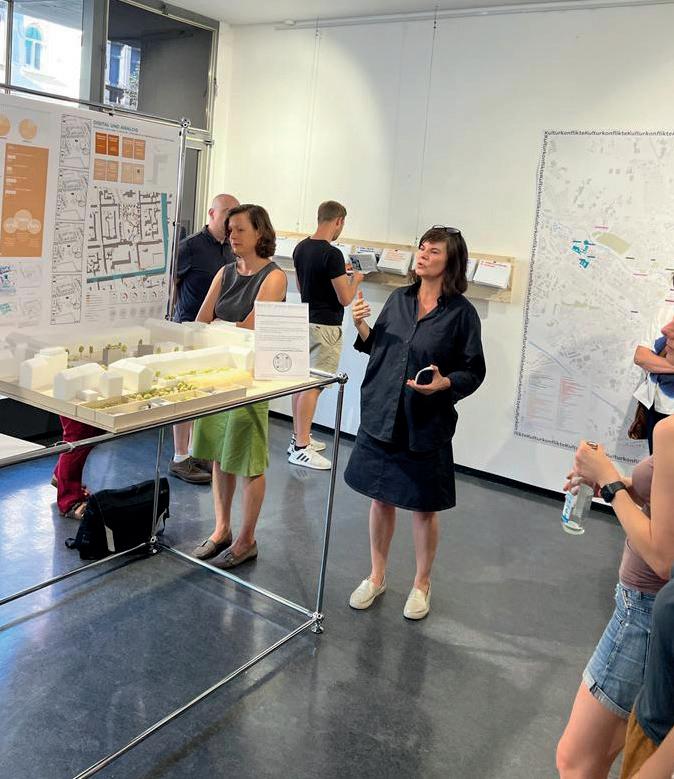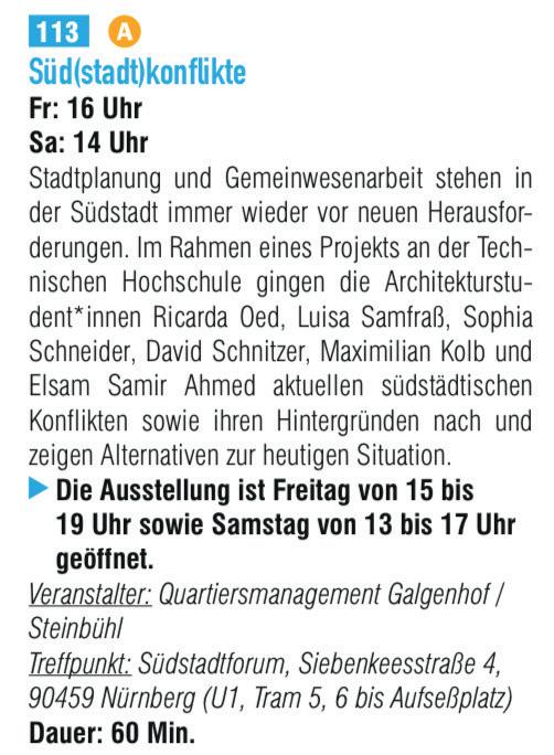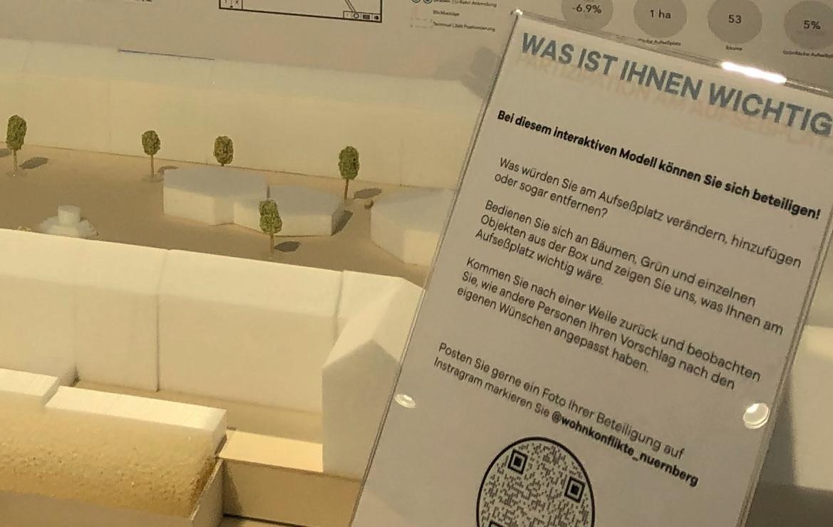 Ausstellung im Offenen Büro der Stadt Nürnberg. Die aktuelle Wohnungs- und globale Klimakrise stellt neue Herausforderungen an das städtische (Wieder-)Bauen und die Stadt(um)planung in Nürnberg. Die Ausstellung zeigt Arbeiten von Studierenden (u.a. Partizipation am Aufseßplatz, Nürnberg - Ricarda Oed), welche sich mit ausgewählten Konflikten der Nürnberger Stadt beschäftigten. Das Masterprojekt wurde geleitet von Prof.in und Dr.in Gabu Heindl.