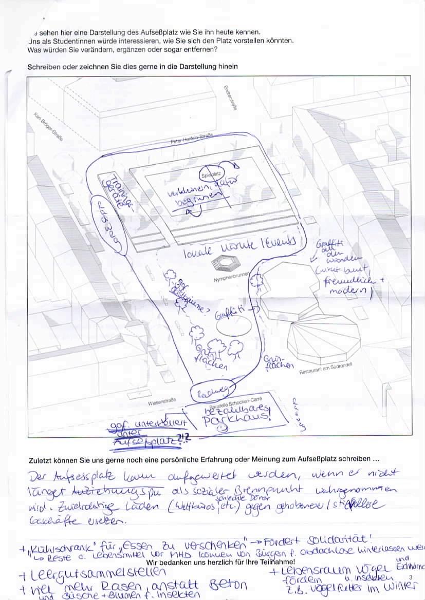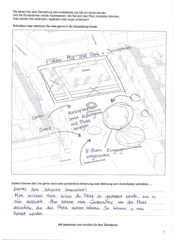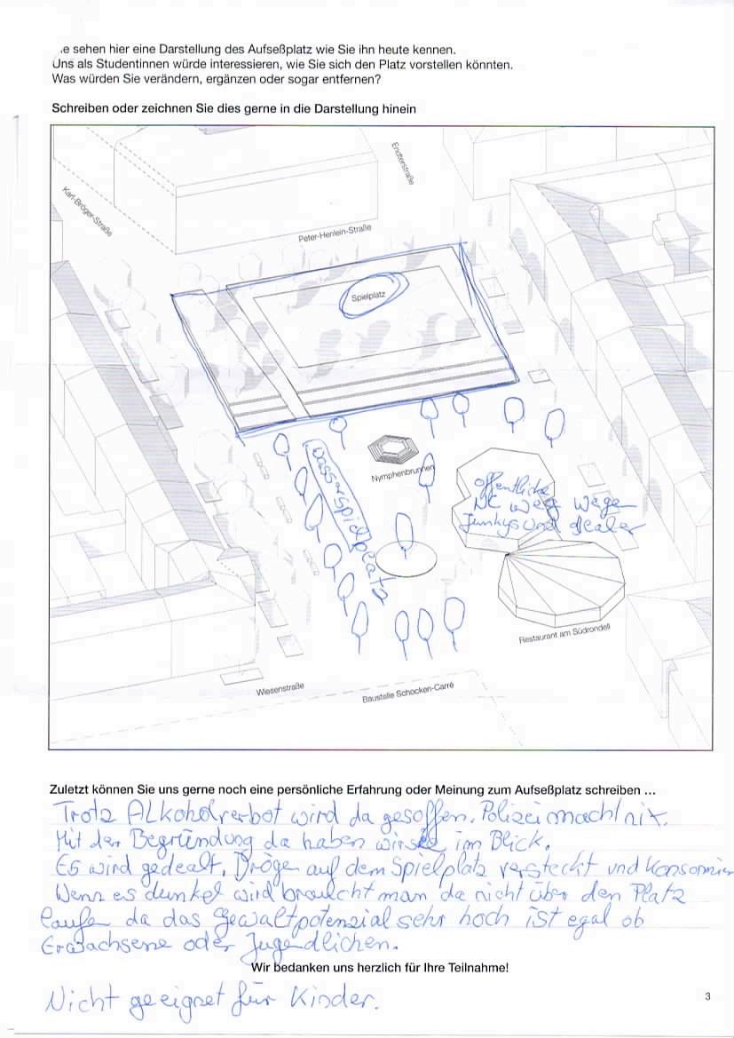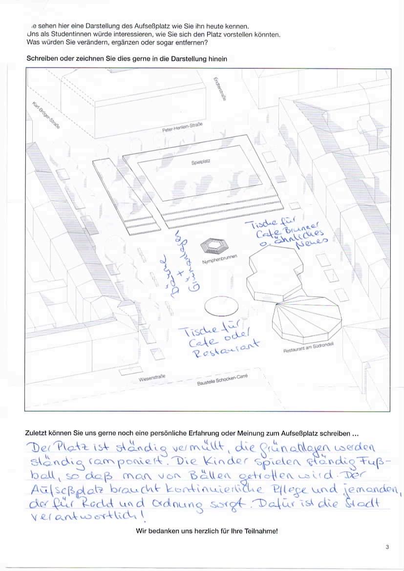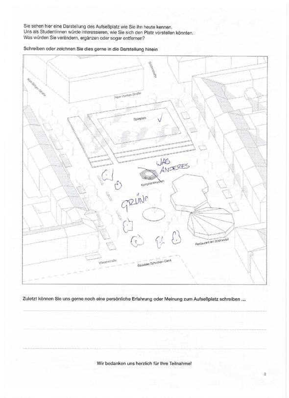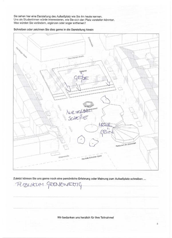 Ergebnis: "Eine Umgestaltung des Platzes wünscht sich die Mehrzahl der Befragten. Neben einer Begrünung und freundlicheren Gestaltung sollten bei der Umgestaltung auch die Bedürfnisse der Kinder berücksichtigt werden."