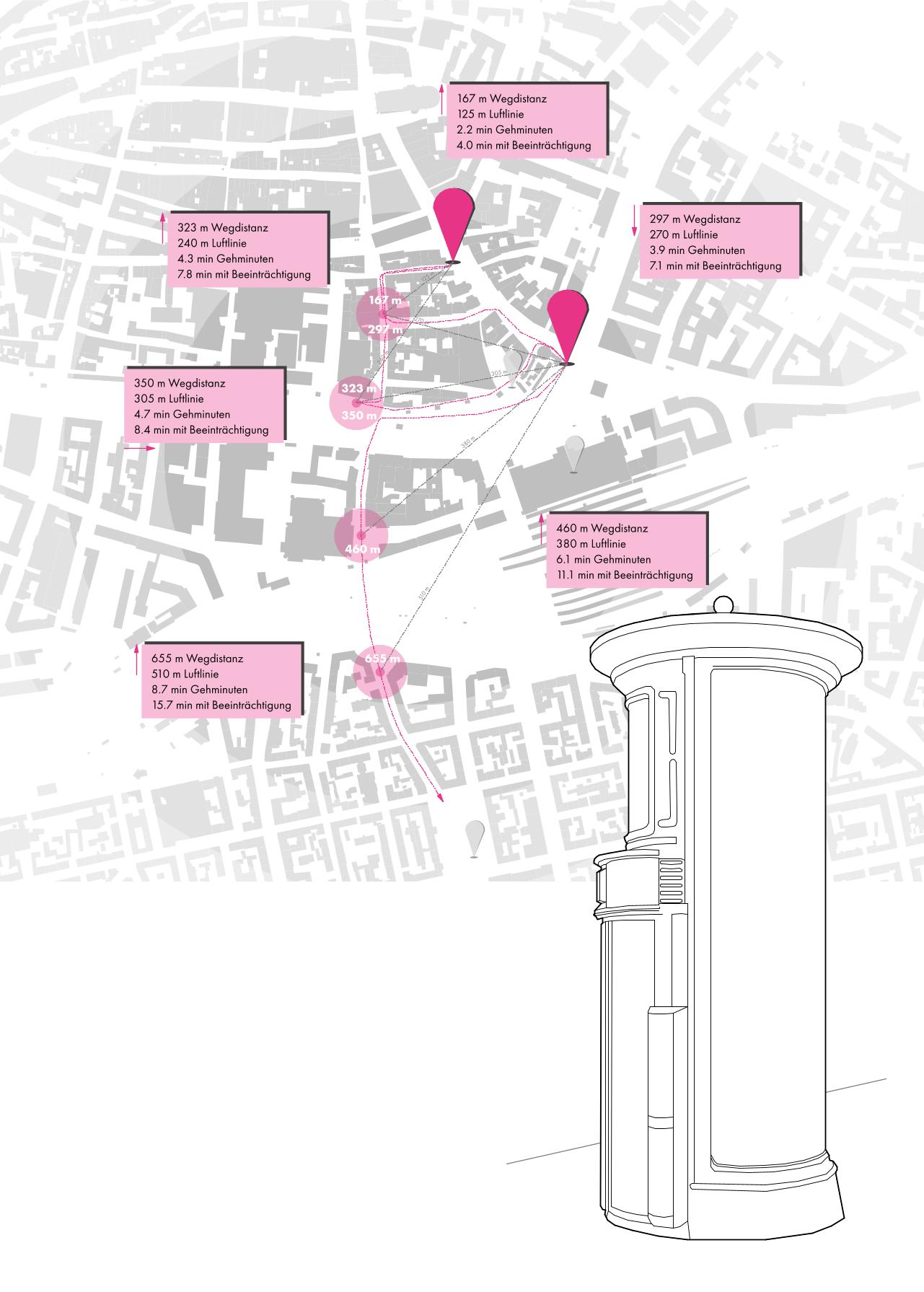 Im Dezember 2023 veröffentlichte die Stadt Nürn- berg die Neuauflage der Broschüre über öffentliche Toiletten in der Nürnberger Innenstadt. Diese können, wie in der zugehörigen Verortung dargestellt, in die Kategorie Litfaßsäule, eigener Raum und U-Bahn eingeteilt werden. Diese wurden in der genannten Abbildung, wie auch in der Broschüre kartiert. Die Stadt Nürnberg verwies dabei bereits auf Informatio- nen wie die Barrierefreiheit, Kosten, die geschlechtliche Zuordnung, Wickeltische und Öffnungszeiten. In der Abbildung wurden diese Punkte aufgelistet und die die Wegstrecke aus den Analysebereichen zur nächsten öffentlichen Toilette berechnet. Hierbei bleibt unberücksichtigt, ob die nähste Toilette einen Wickeltisch außerhalb der Damenkabine besitzt, kostenlos zugänglich ist, eine inklusive Beschilderung oder Gesamtausstattung hat, oder geöffnet ist.