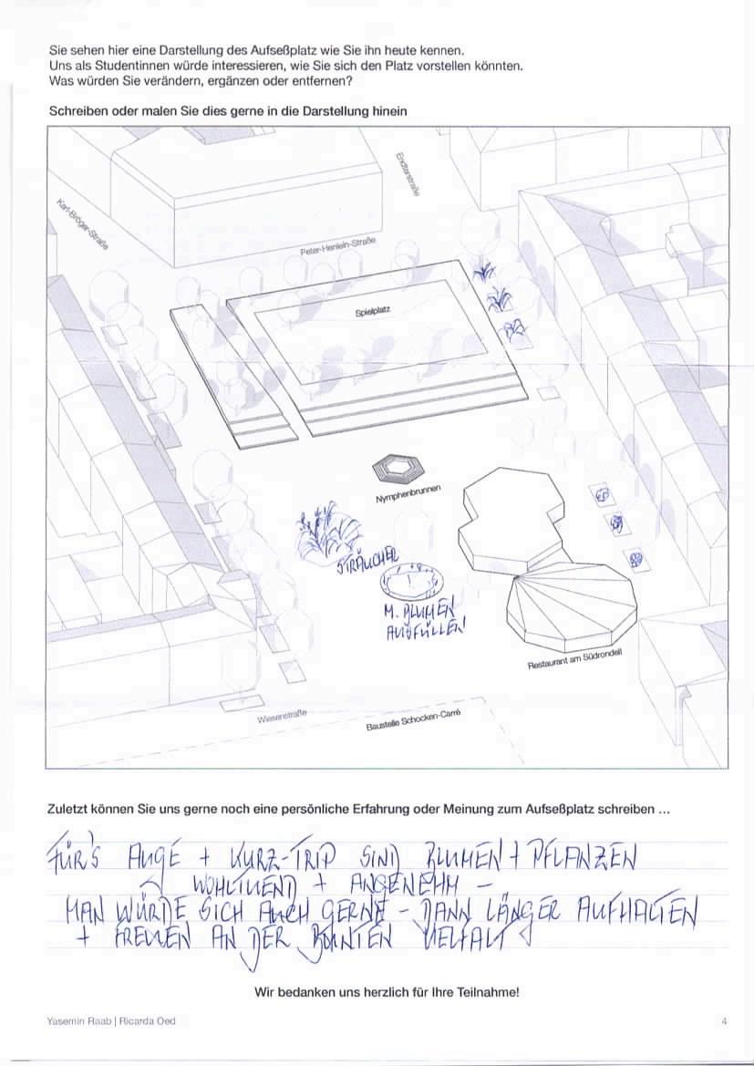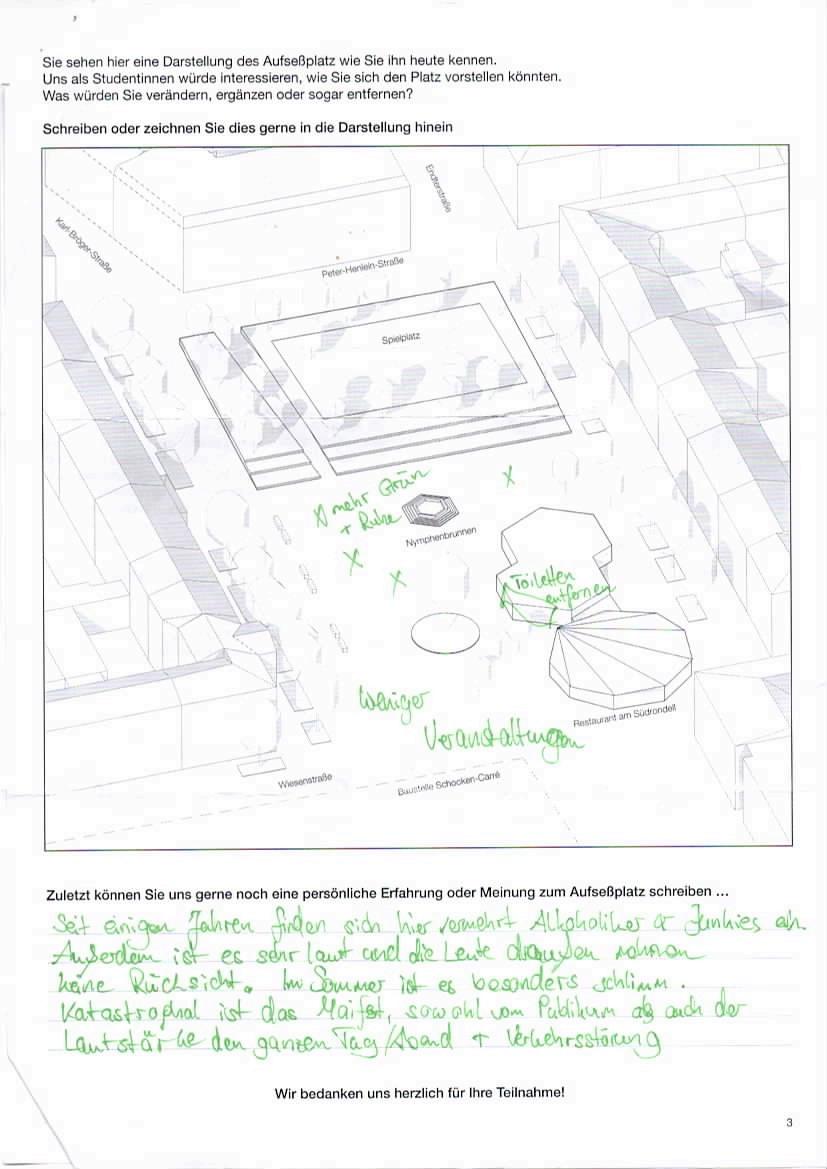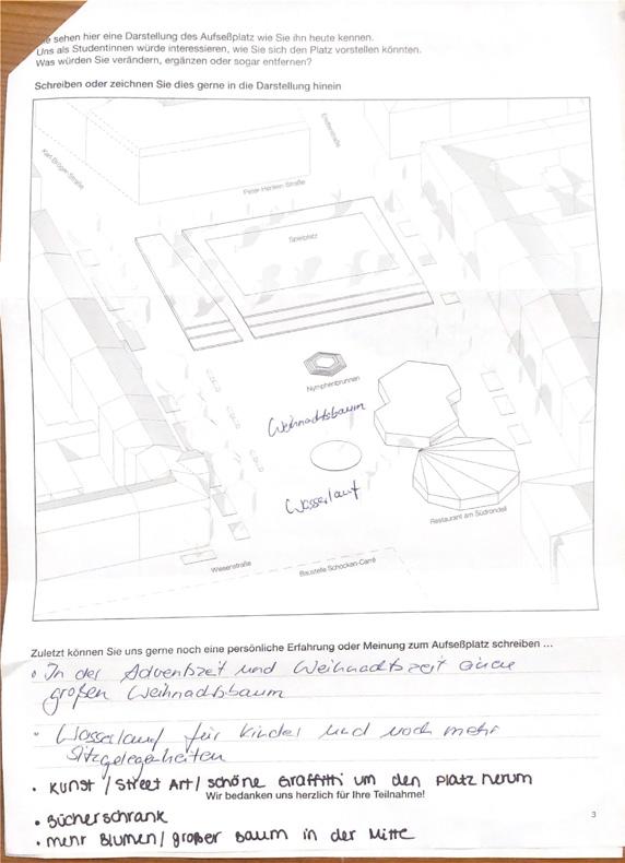 Um ein Verständnis der heutigen Situation zu erhalten, wurden Anwohner*innen zu ihrer Meinung des Platzes und ihren Kenntnissen über Beteiligungsformate befragt.